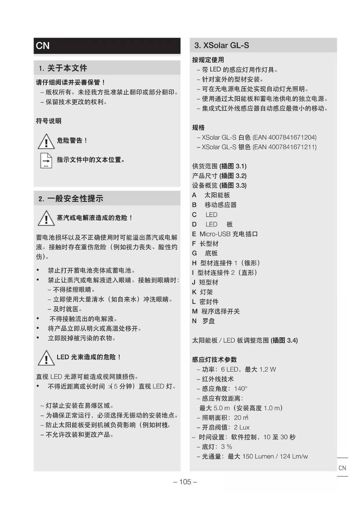 – XSolar GL-S 白色(EAN4007841671204) – XSolar GL-S 银色(EAN4007841671211) 供货范围(插图 3.1) 产品尺寸(插图 3.2) 设备概览(插图 3.3) A 太阳能板 B 移动感应器 C LED D LED 板 E Micro-USB 充电插口 F 长型材 G 底板 H 型材连接件1(锥形) I 型材连接件2(直形) J 短型材 K 灯架 L 密封件 M 程序选择开关 N 罗盘 太阳能板/ LED 板调整范围(插图 3.4)