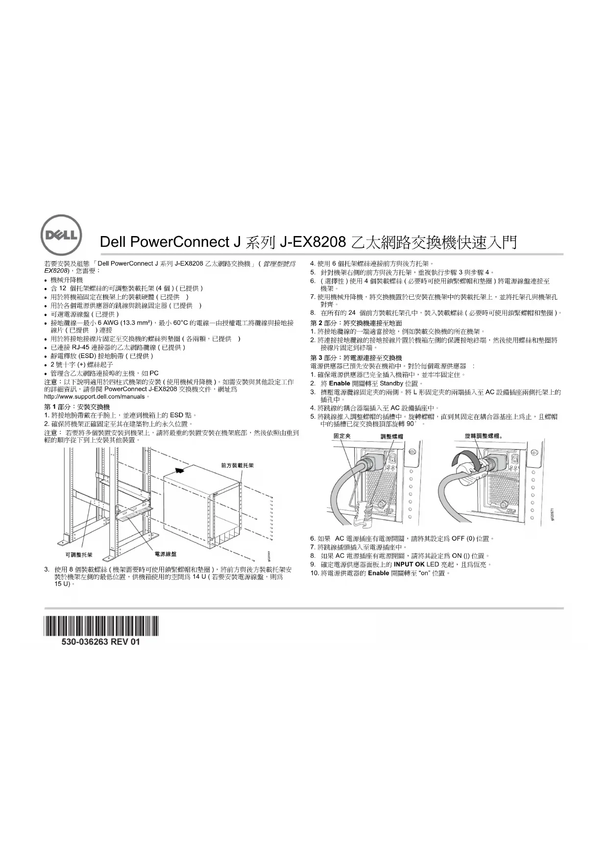 EX8208),您需要: z 機械升降機 z 含 12 個托架螺絲的可調整裝載托架 (4 個 ) ( 已提供 ) z 用於將機箱固定在機架上的裝載硬體 ( 已提供 )z 用於各個電源供應器的跳線與跳線固定器 ( 已提供 ) z 可選電源線盤 ( 已提供 ) z 接地纜線—最小 6 AWG (13.3 mm²),最小 60°C 的電線—由授權電工將纜線與接地接 線片 ( 已提供 ) 連接 z 用於將接地接線片固定至交換機的螺絲與墊圈 ( 各兩顆,已提供 ) z 已連接 RJ-45 連接器的乙太網路纜線 ( 已提供 ) z 靜電釋放 (ESD) 接地腕帶 ( 已提供 ) z 2 號十字 (+) 螺絲起子 z 管理含乙太網路連接埠的主機,如 PC 注意: 以下說明適用於四柱式機架的安裝 ( 使用機械升降機 )。如需安裝與其他設定工作 的詳細資訊,請參閱 PowerConnect J-EX8208 交換機文件,網址為 http://www.support.dell.com/manuals。 第 1 部分:安裝交換機