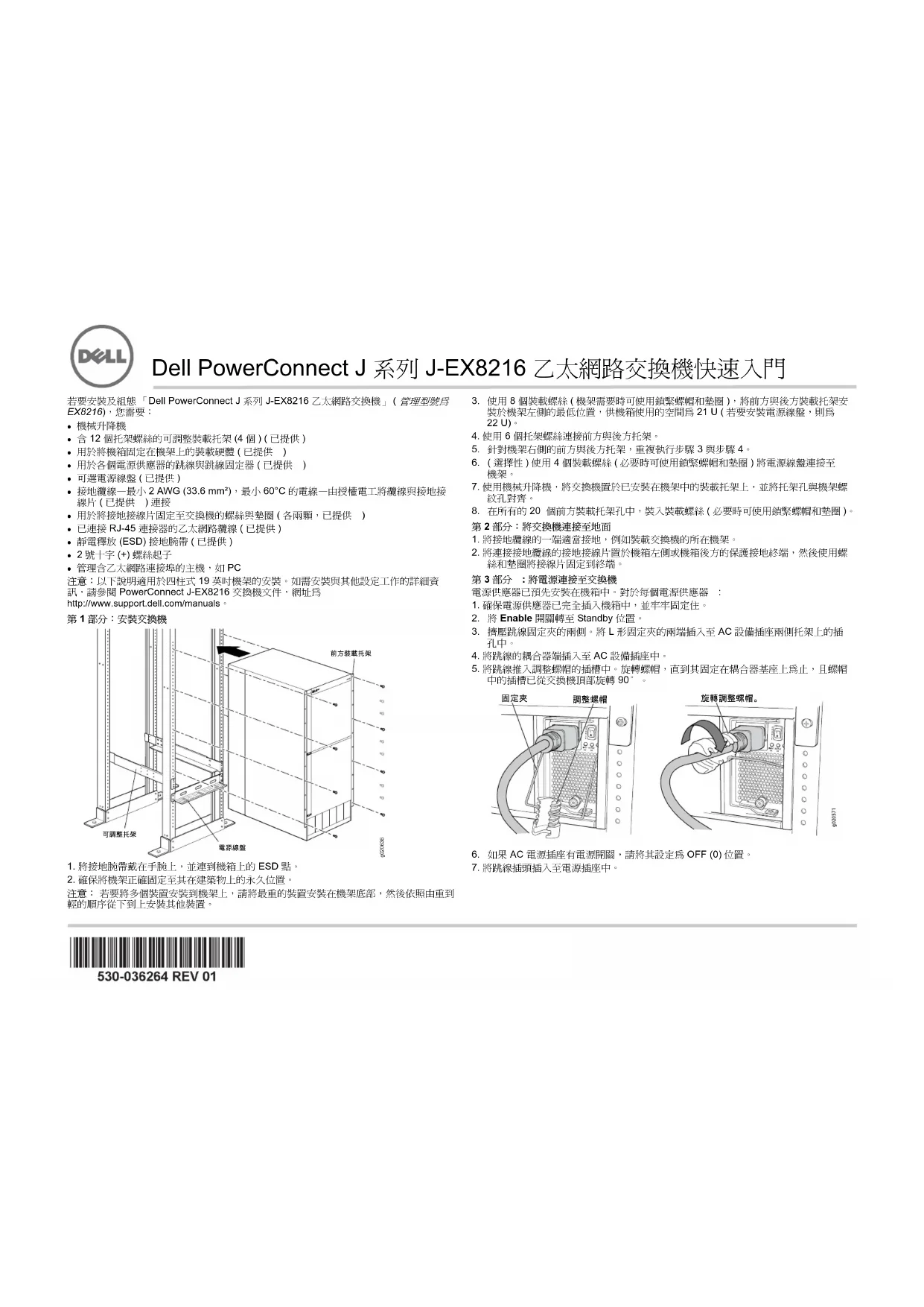 EX8216),您需要: z 機械升降機 z 含 12 個托架螺絲的可調整裝載托架 (4 個 ) ( 已提供 ) z 用於將機箱固定在機架上的裝載硬體 ( 已提供 )z 用於各個電源供應器的跳線與跳線固定器 ( 已提供 ) z 可選電源線盤 ( 已提供 ) z 接地纜線—最小 2 AWG (33.6 mm²),最小 60°C 的電線—由授權電工將纜線與接地接 線片 ( 已提供 ) 連接 z 用於將接地接線片固定至交換機的螺絲與墊圈 ( 各兩顆,已提供 ) z 已連接 RJ-45 連接器的乙太網路纜線 ( 已提供 ) z 靜電釋放 (ESD) 接地腕帶 ( 已提供 ) z 2 號十字 (+) 螺絲起子 z 管理含乙太網路連接埠的主機,如 PC 注意: 以下說明適用於四柱式 19 英吋機架的安裝。如需安裝與其他設定工作的詳細資 訊,請參閱 PowerConnect J-EX8216 交換機文件,網址為 http://www.support.dell.com/manuals。 第 1 部分:安裝交換機