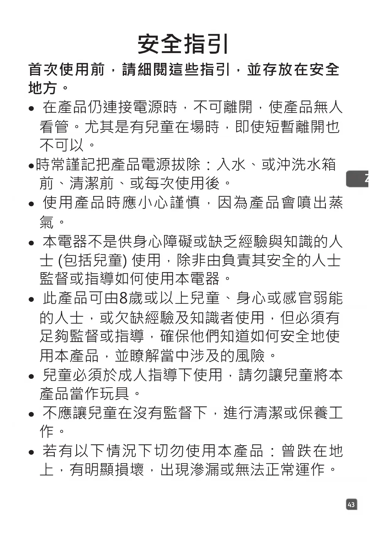 - 此產品可由8歲或以上兒童、身心或感官弱能 的人士,或欠缺經驗及知識者使用,但必須有 足夠監督或指導,確保他們知道如何安全地使 用本產品,並瞭解當中涉及的風險。