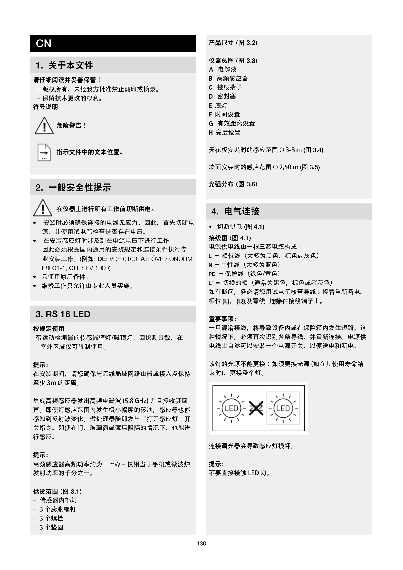 10015020025090°90°180° 30°30°150°150°60°120°60°120°cd / 1000 lmC0 / C180 C90 / C270 高频技术 5.8 GHz(不受温度影响,可以对最微小的移动作出反应) 感应角度 360° 时 160° 开口角度 发射功率 约 1 mW 感应有效距离 Ø 3 - 8 m 时间设置 5 s - 15 min 底灯 10 % 亮度设置 2 - 2,000 Lux 保护形式 IP 44 防护等级 II 温度范围 -10 至 +40°C 能效等级 本产品具备一个能效等级为“E”的光源。 CN- 134 -
