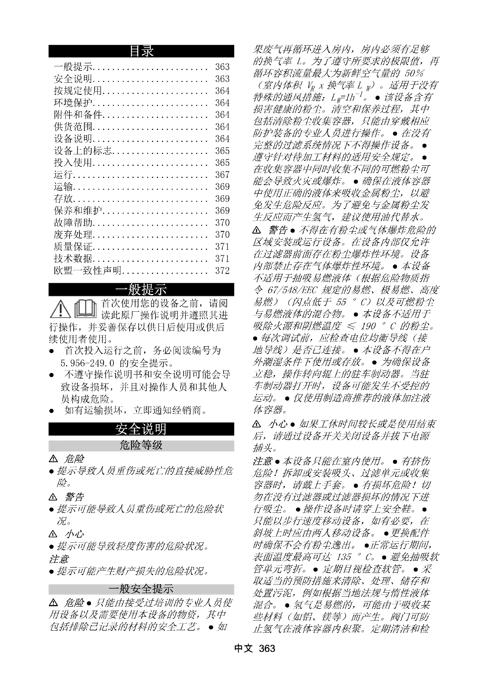 在清空和维护工作(包括废弃处理集尘容 器)期间佩戴规定的防护装备。 本设备适用于安装在 22 区之外吸除可燃粉