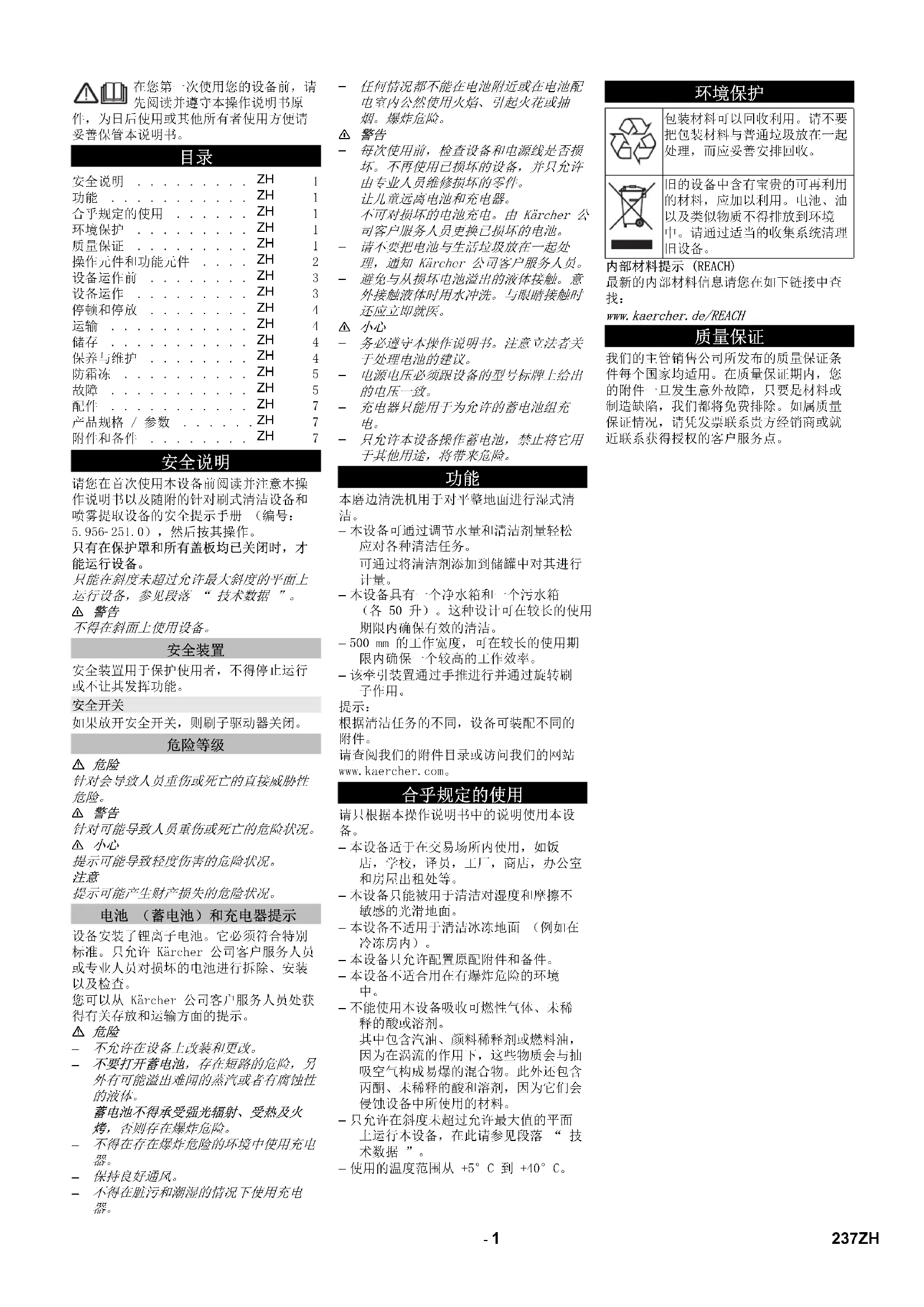 Chairman of the Board of Management Director Regulatory Affairs & Certification Aksesoris dan suku cadang 236 ID- 1 在您第一次使用您的设备前,请先阅读并遵守本操作说明书原件,为日后使用或其他所有者使用方便请妥善保管本说明书。请您在首次使用本设备前阅读并注意本操作说明书以及随附的针对刷式清洁设备和喷雾提取设备的安全提示手册 (编号:5.956 251.0),然后按其操作。只有在保护罩和所有盖板均已关闭时,才能运行设备。 只能在斜度未超过允许最大斜度的平面上 运行设备,参见段落 “ 技术数据 ”。