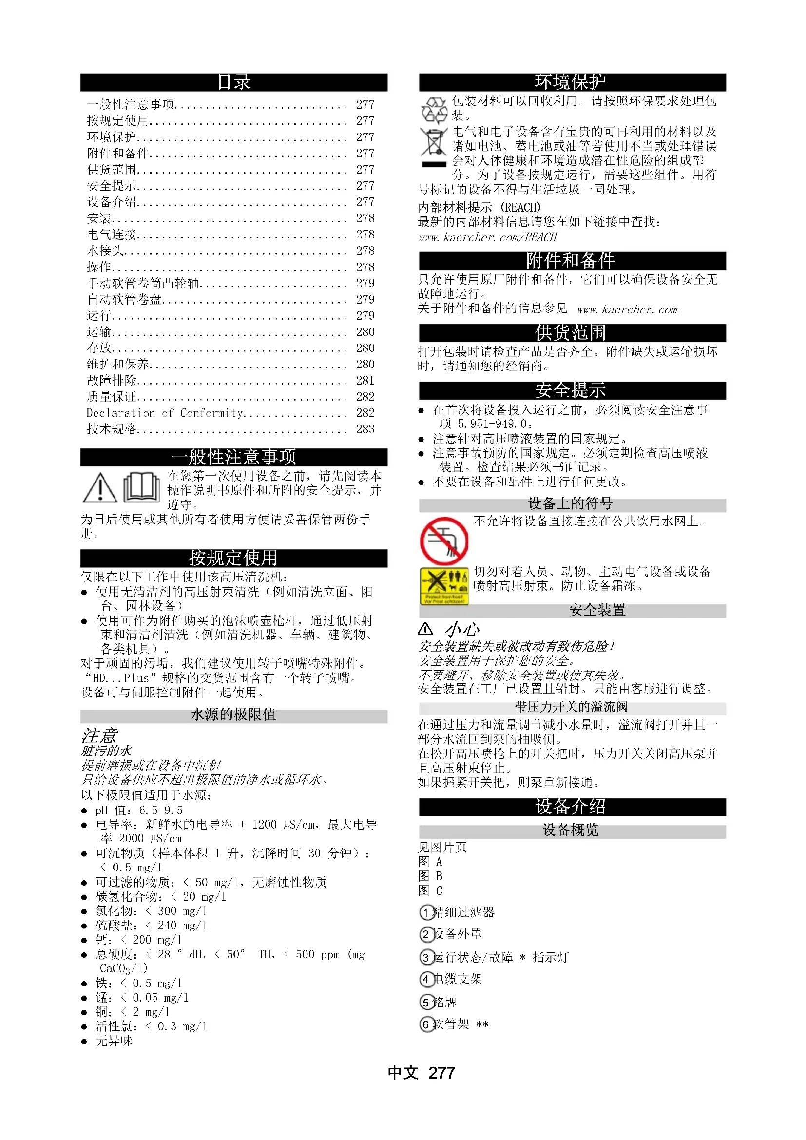 /l) ● 铁:< 0.5 mg/l● 锰:< 0.05 mg/l● 铜:< 2 mg/l● 活性氯:< 0.3 mg/l● 无异味 包装材料可以回收利用。请按照环保要求处理包 电气和电子设备含有宝贵的可再利用的材料以及诸如电池、蓄电池或油等若使用不当或处理错误会对人体健康和环境造成潜在性危险的组成部分。为了设备按规定运行,需要这些组件。用符号标记的设备不得与生活垃圾一同处理。内部材料提示 (REACH)最新的内部材料信息请您在如下链接中查找: www.kaercher.com/REACH