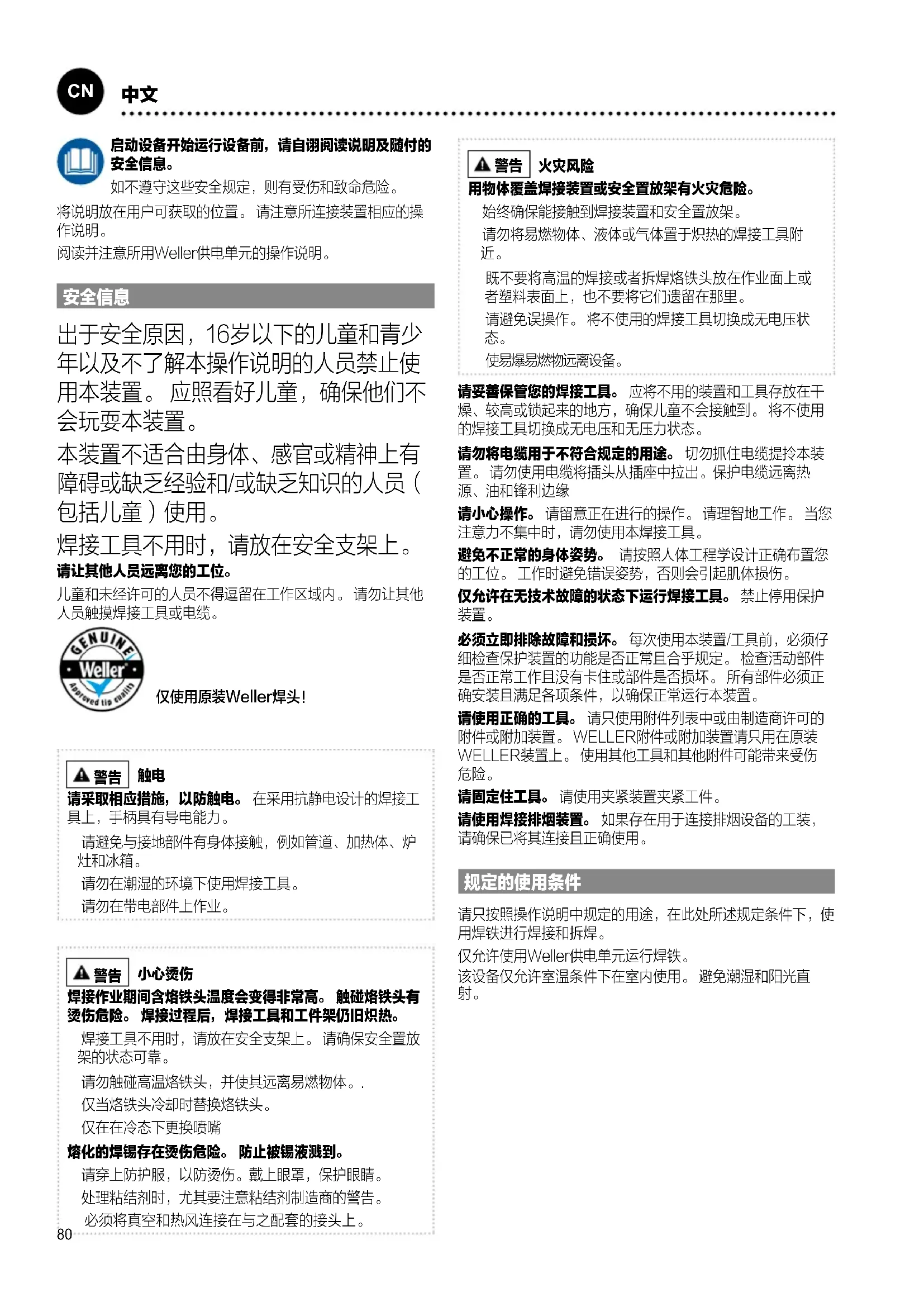 请只按照操作说明中规定的用途,在此处所述规定条件下,使 用焊铁进行焊接和拆焊。 仅允许使用Weller供电单元运行焊铁。 该设备仅允许室温条件下在室内使用。 避免潮湿和阳光直