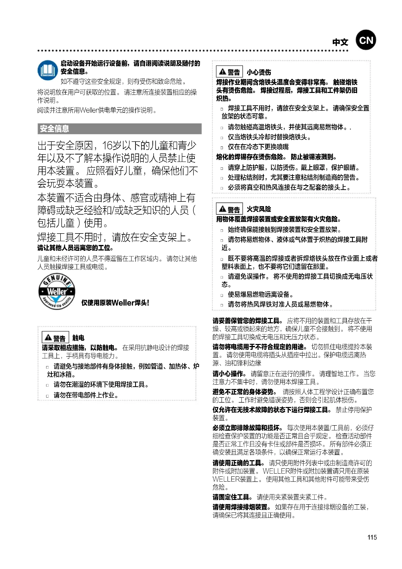焊接工具不用时,请放在安全支架上。 请让其他人员远离您的工位。 儿童和未经许可的人员不得逗留在工作区域内。 请勿让其他 人员触摸焊接工具或电缆。 仅使用原装Weller焊头!
