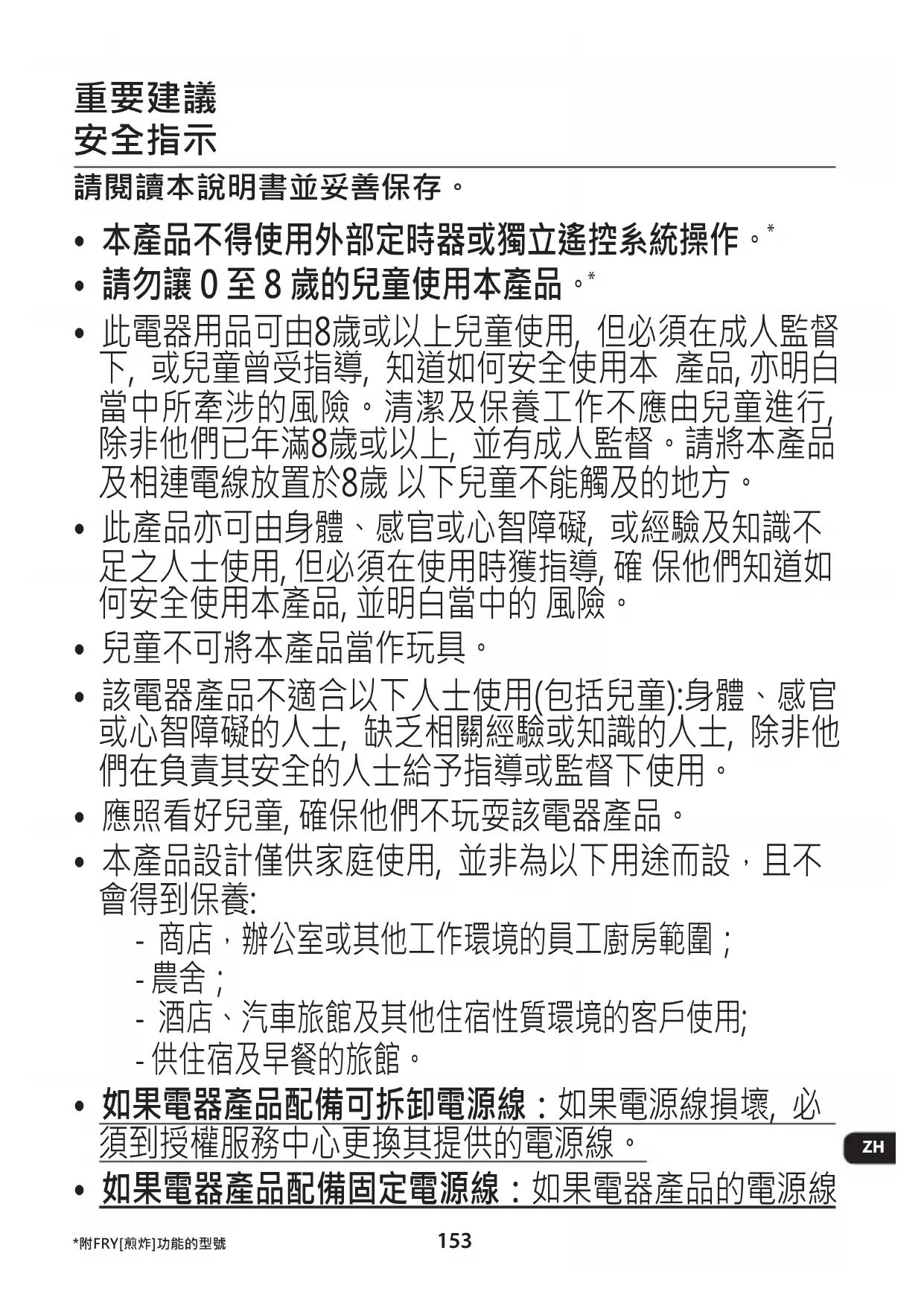 - 如果電器產品配備固定電源線:如果電器產品的電源線 *附FRY[煎炸]功能的型號154 損壞, 為了您的安全, 必須由授權服務中心或合資格的人