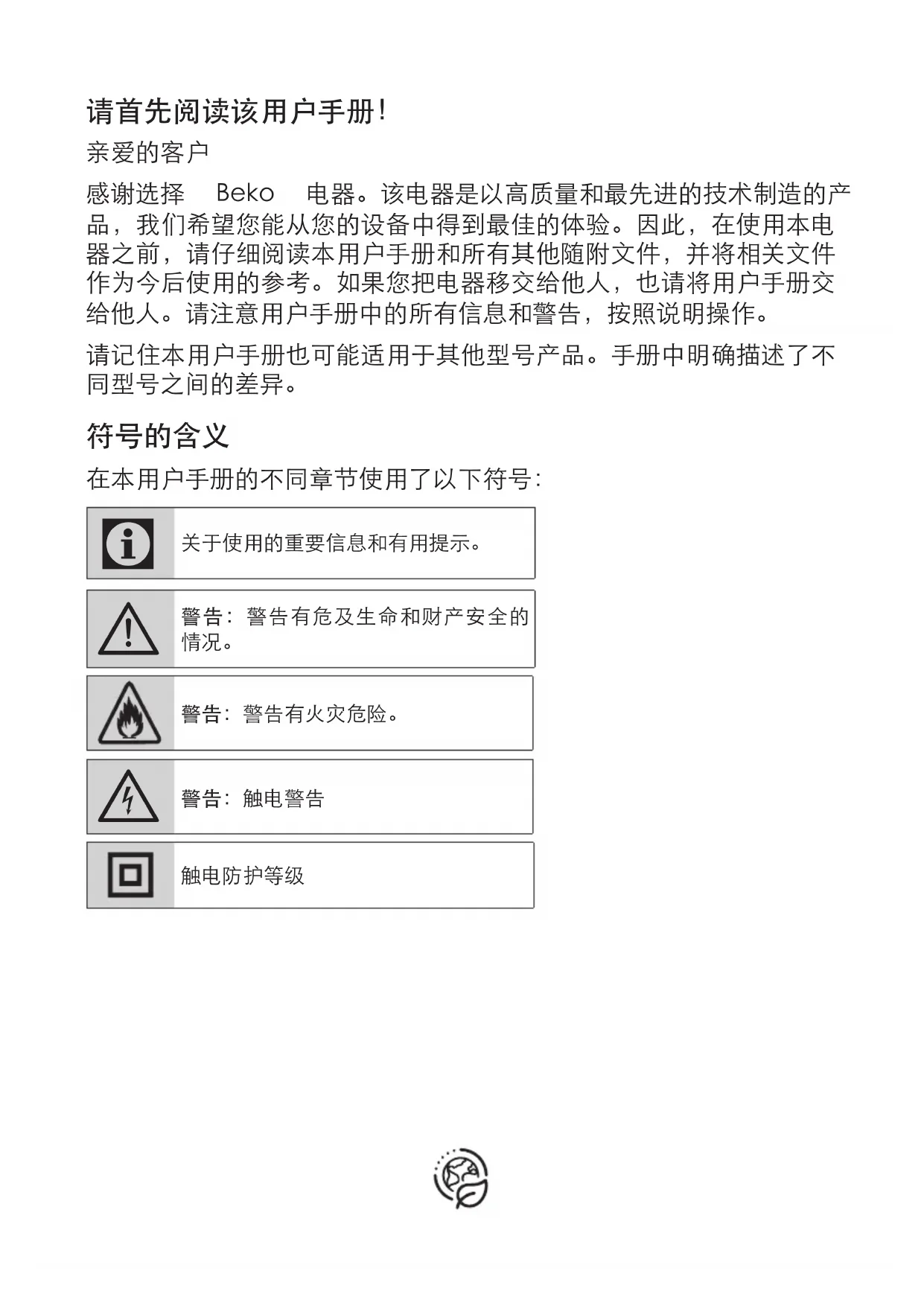 感谢选择 Beko 电器。该电器是以高质量和最先进的技术制造的产 品,我们希望您能从您的设备中得到最佳的体验。因此,在使用本电 器之前,请仔细阅读本用户手册和所有其他随附文件,并将相关文件 作为今后使用的参考。如果您把电器移交给他人,也请将用户手册交 给他人。请注意用户手册中的所有信息和警告,按照说明操作。 请记住本用户手册也可能适用于其他型号产品。手册中明确描述了不