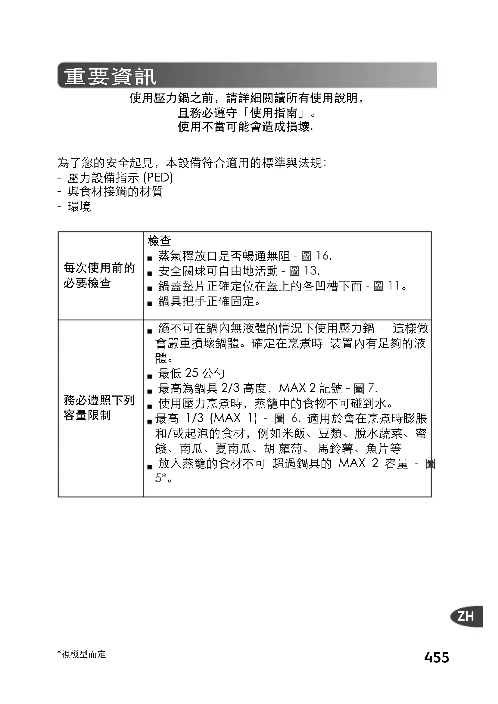 使用壓力鍋之前,請詳細閱讀所有使用說明, 且務必遵守「使用指南」。 使用不當可能會造成損壞。 為了您的安全起見,本設備符合適用的標準與法規: - 壓力設備指示 (PED)
