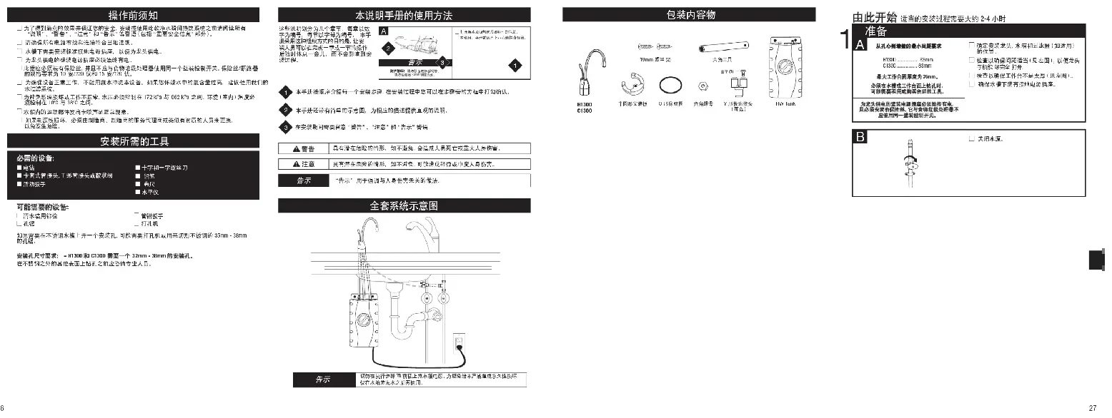 触电危险:要降低触电风险,切勿将本产品、软线或塞子放入或暴露于雨、潮湿区或任何液体中或置于潮湿表面上。如果任何电气产品落入水中,请立刻 拔下电源插头。切勿将手伸进水中。重要提示:在重新连接到电源之前,应由 有资质的技术员对本产品进行检查。要降低与摄入污染物相关的风险:在使用本系统之前或之后,切勿使用有微生物污染的非安全用水或未经过充分消毒的非合格用水。人身伤害/财产损坏:要降低与因安装工钻通安装区域现有电力布线导致触碰危险电压相关的风险:在选择系统支架的安装位置时,切勿将其安装在钻孔工具可能经过的电力布线附近。还要避免钻穿水管的风险,可能造成财产损坏。本设备必须接地。此净水瞬间热饮系统配备有一根带有接地导体和接地针的线缆。插头必须连接到适当的电源插座上,该电源插座必须接地,且其安装须符合当地所有法规和法令。切勿改动本设备随附的 插头 – 如果插头无法插入电源插座,请要求有资质的电工安装合适的插座。如果不清楚净水瞬间热饮 系统是否已正确接地,请向有资质的电工或零售商咨询。 C1300-SS/ H1300-1,-2: 1 年保修