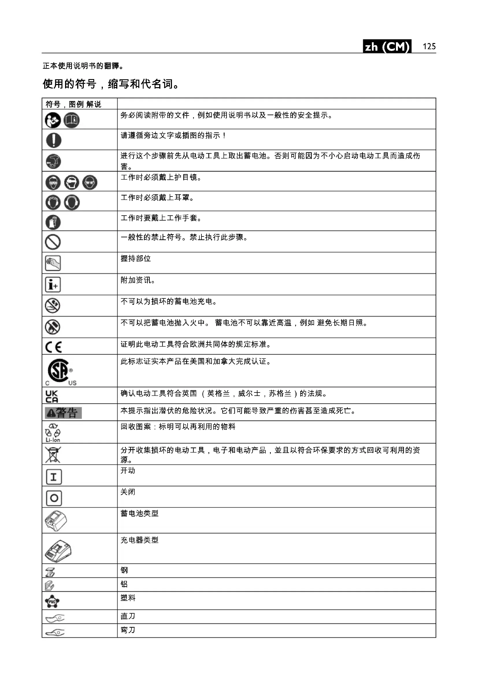 不可以为损坏的蓄电池充电。 不可以把蓄电池抛入火中。 蓄电池不可以靠近高温,例如 避免长期日照。 证明此电动工具符合欧洲共同体的规定标准。 此标志证实本产品在美国和加拿大完成认证。 确认电动工具符合英国 (英格兰,威尔士,苏格兰)的法规。 本提示指出潜伏的危险状况。它们可能导致严重的伤害甚至造成死亡。 回收图案:标明可以再利用的物料 分开收集损坏的电动工具,电子和电动产品,並且以符合环保要求的方式回收可利用的资