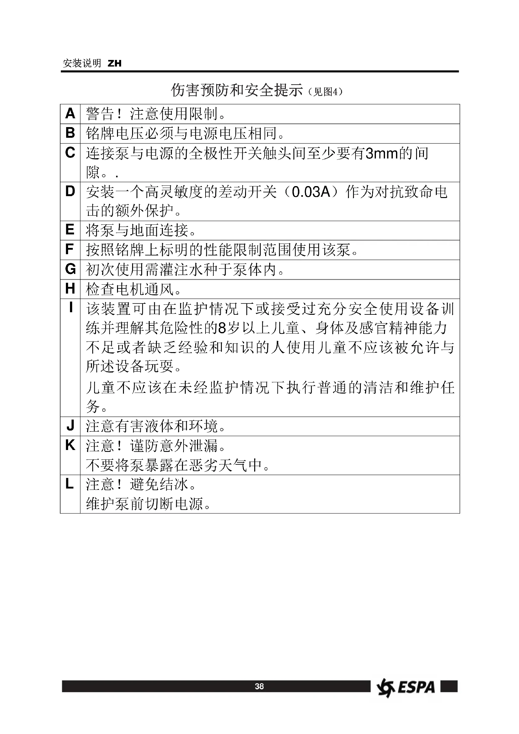 注意:如发生故障或损坏,只能由授权服务代 理维修,请勿自行维修。 官方技术服务列表请查询官方网站 www.espa.com. 当水泵最终弃置时,请注意本产品不包含任何有毒 或污染性材料,所有主要部件所采用的材料均允许