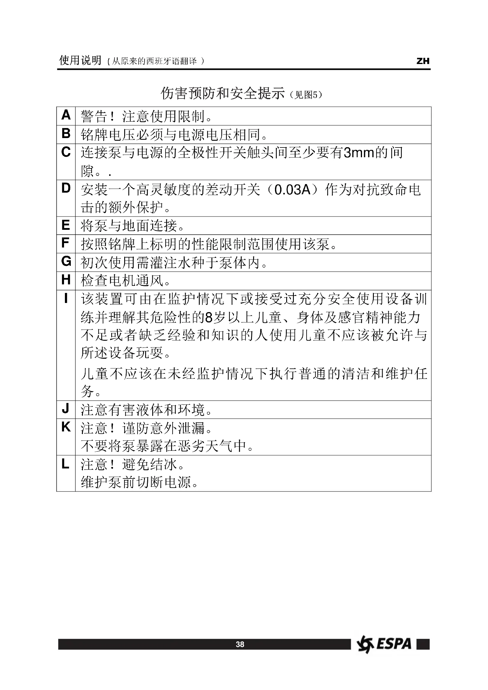注意:如发生故障或损坏,只能由授权服务代 理维修,请勿自行维修。 官方技术服务列表请查询官方网站 www.espa.com. 当水泵最终弃置时,请注意本产品不包含任何有毒或 污染性材料,所有主要部件所采用的材料均允许选择