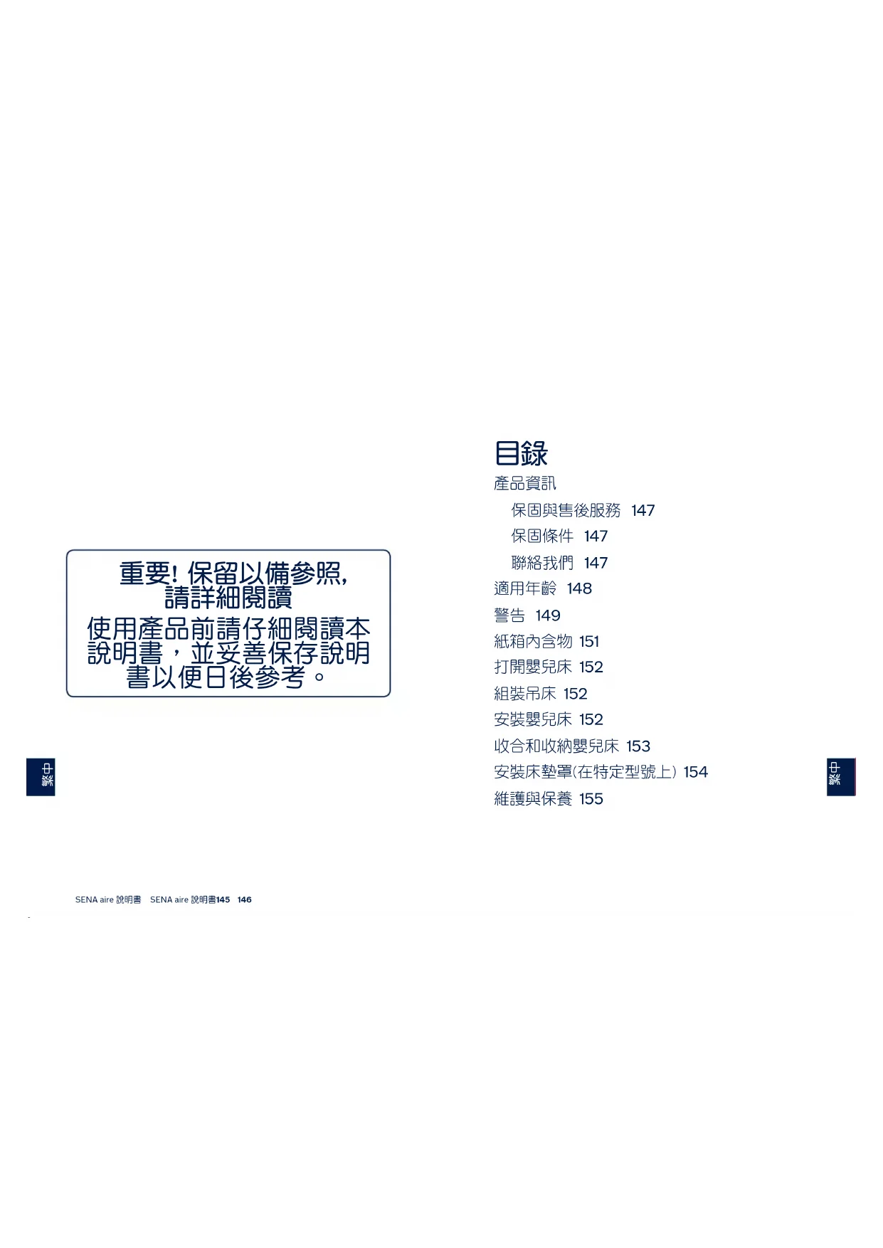保固與售後服務 147 保固條件 147 聯絡我們 147 適用年齡 148 警告 149 紙箱內含物 151 打開嬰兒床 152 組裝吊床 152 安裝嬰兒床 152 收合和收納嬰兒床 153 安裝床墊罩(在特定型號上) 154 維護與保養 155SENA aire 說明書 SENA aire 說明書147 148