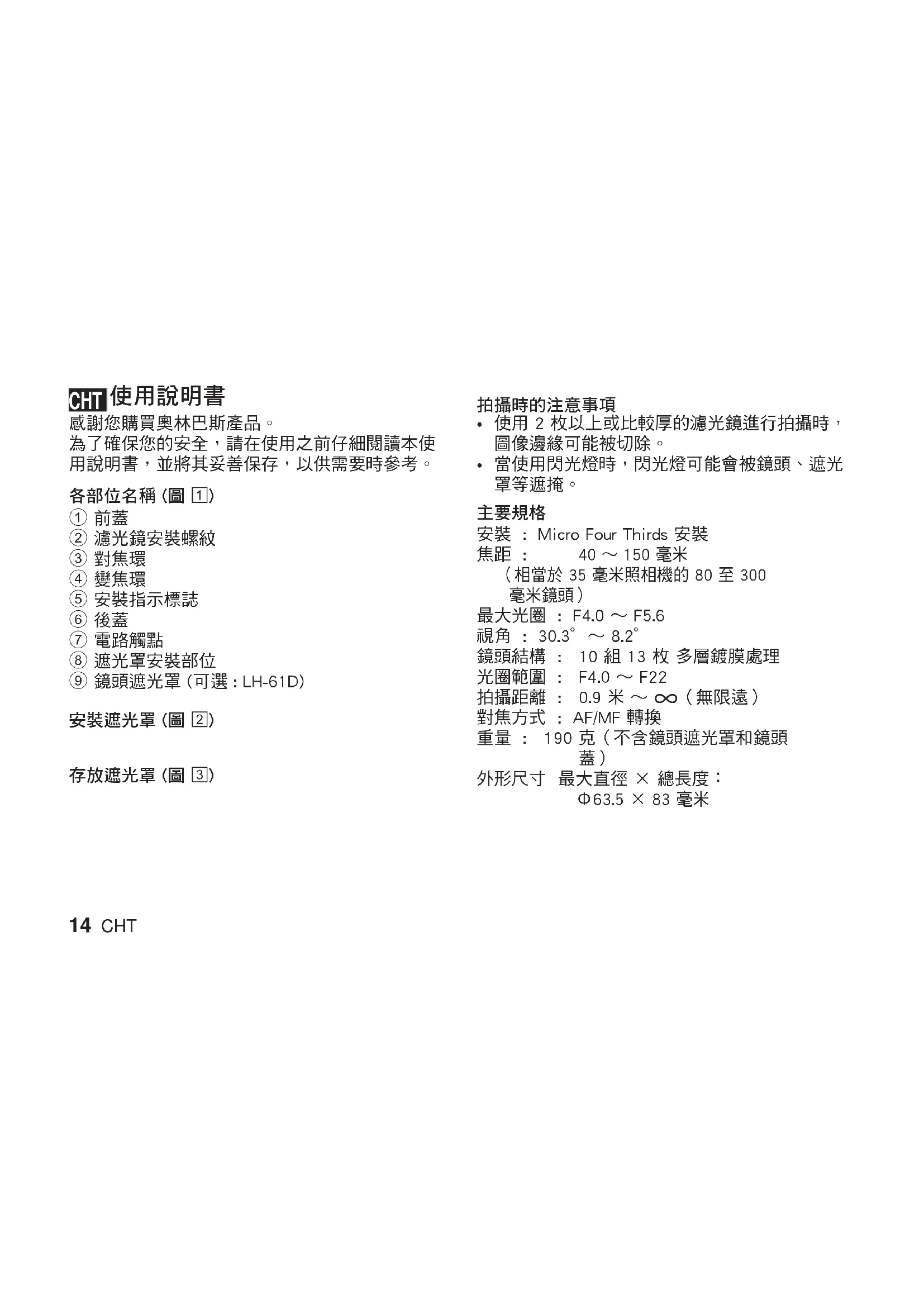 感謝您購買奧林巴斯產品。 為了確保您的安全,請在使用之前仔細閱讀本使 用說明書,並將其妥善保存,以供需要時參考。 各部位名稱 (圖 1) 1 前蓋 2 濾光鏡安裝螺紋 3 對焦環 4 變焦環 5 安裝指示標誌 6 後蓋 7 電路觸點 8 遮光罩安裝部位 9 鏡頭遮光罩 (可選 : LH-61D) 安裝遮光罩 (圖 2) 存放遮光罩 (圖 3)