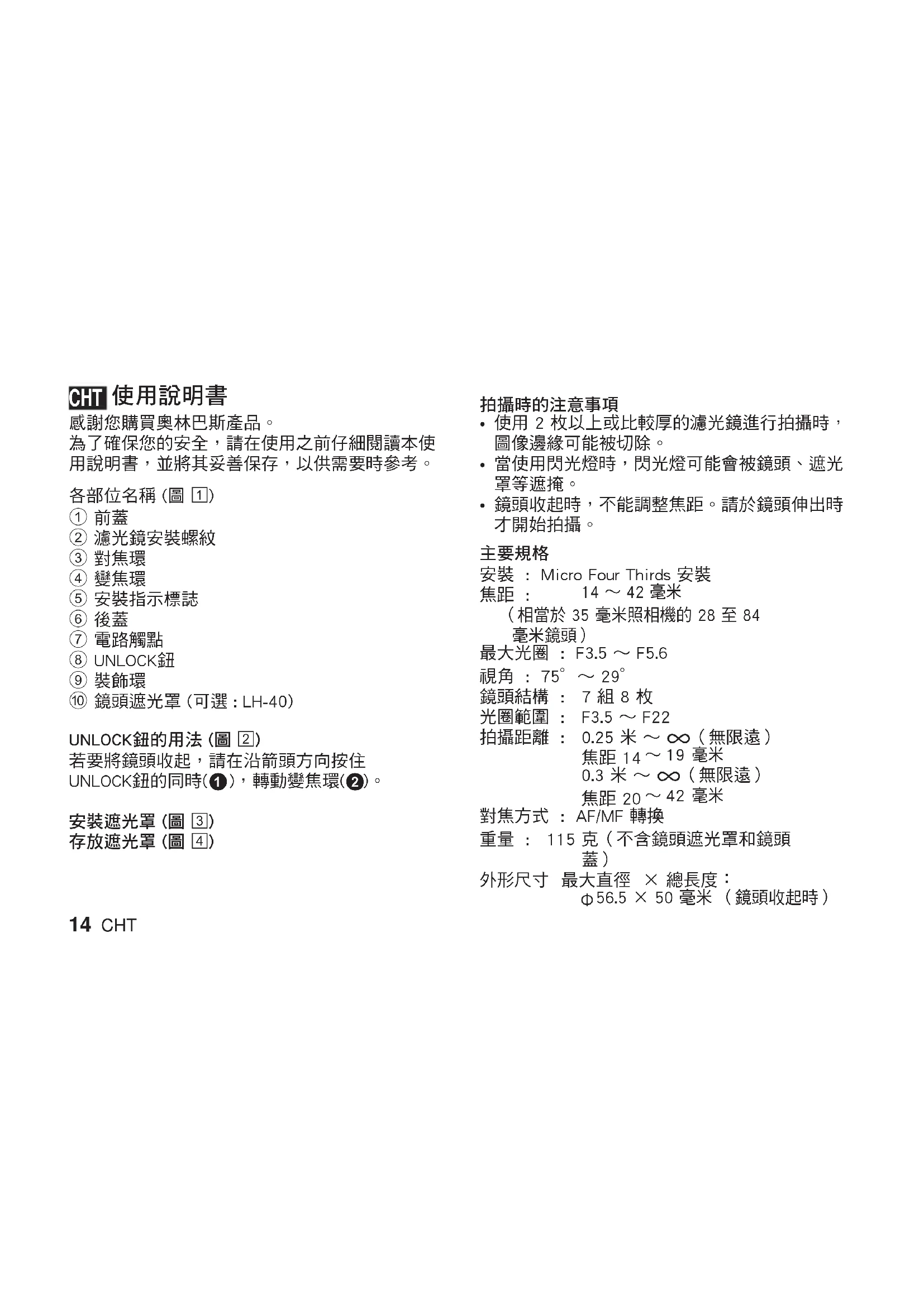 感謝您購買奧林巴斯產品。 為了確保您的安全,請在使用之前仔細閱讀本使 用說明書,並將其妥善保存,以供需要時參考。 各部位名稱 (圖 1) 1 前蓋 2 濾光鏡安裝螺紋 3 對焦環 4 變焦環 5 安裝指示標誌 6 後蓋 7 電路觸點 8 UNLOCK鈕 9 裝飾環 0 鏡頭遮光罩 (可選 : LH-40) UNLOCK鈕的用法 (圖 2) 若要將鏡頭收起,請在沿箭頭方向按住 UNLOCK鈕的同時(