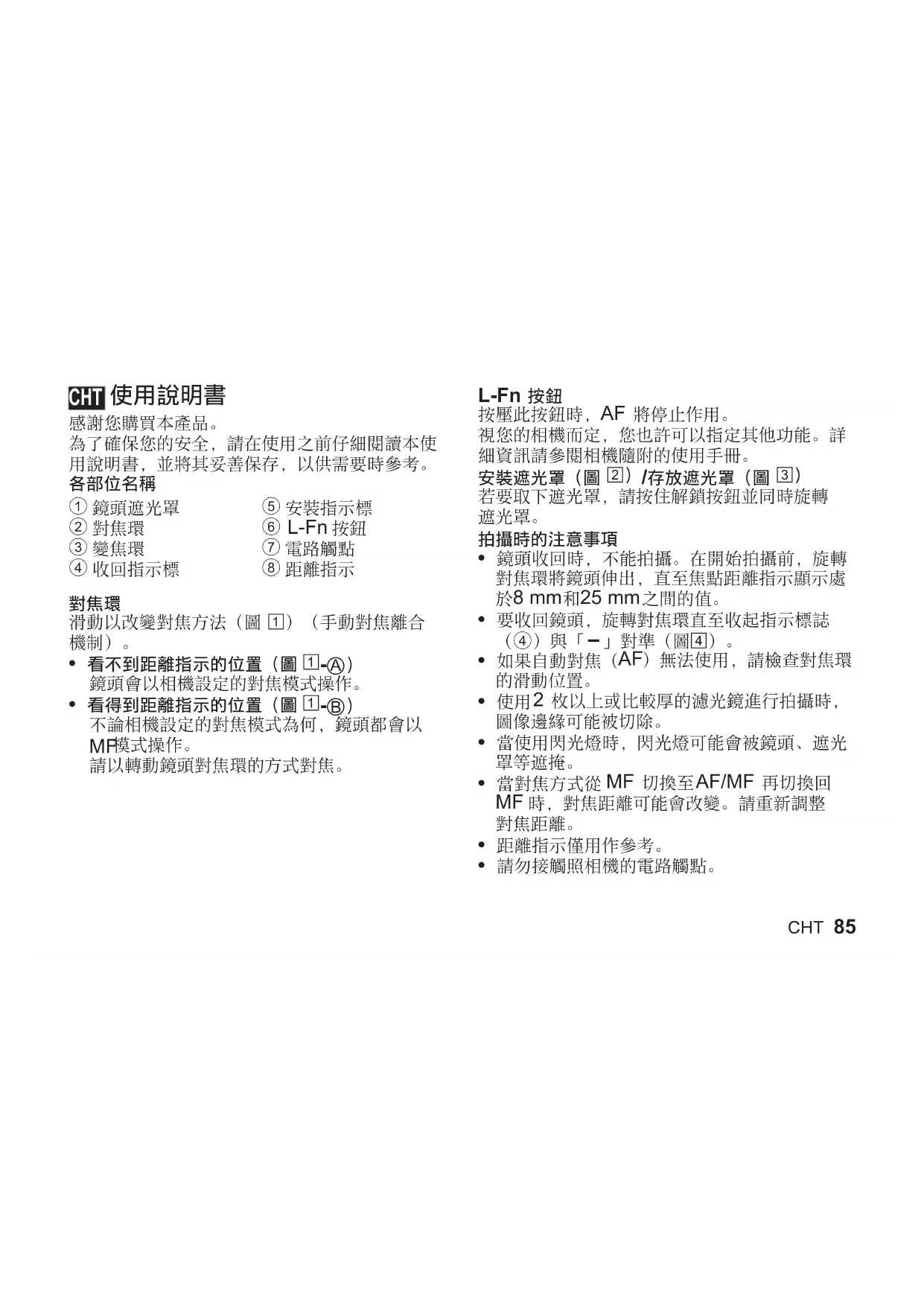 商標。CHT 87 對於因在購買國家或地區以外使用本產品而導致 違反當地法規的行為,製造商不承擔任何責任。 本鏡頭中的軟體可能包含第三方軟體。任何第三 方軟體均符合其版權所有者或許可證發行者規定