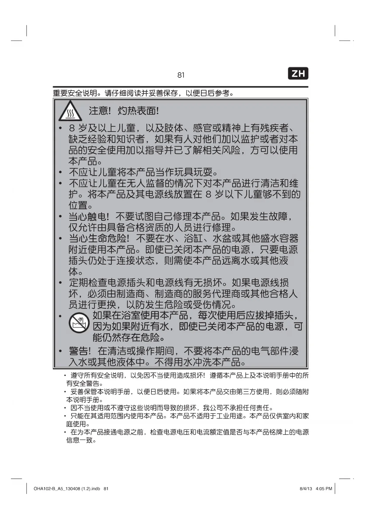 如果在浴室使用本产品,每次使用后应拔掉插头, 因为如果附近有水,即使已关闭本产品的电源,可