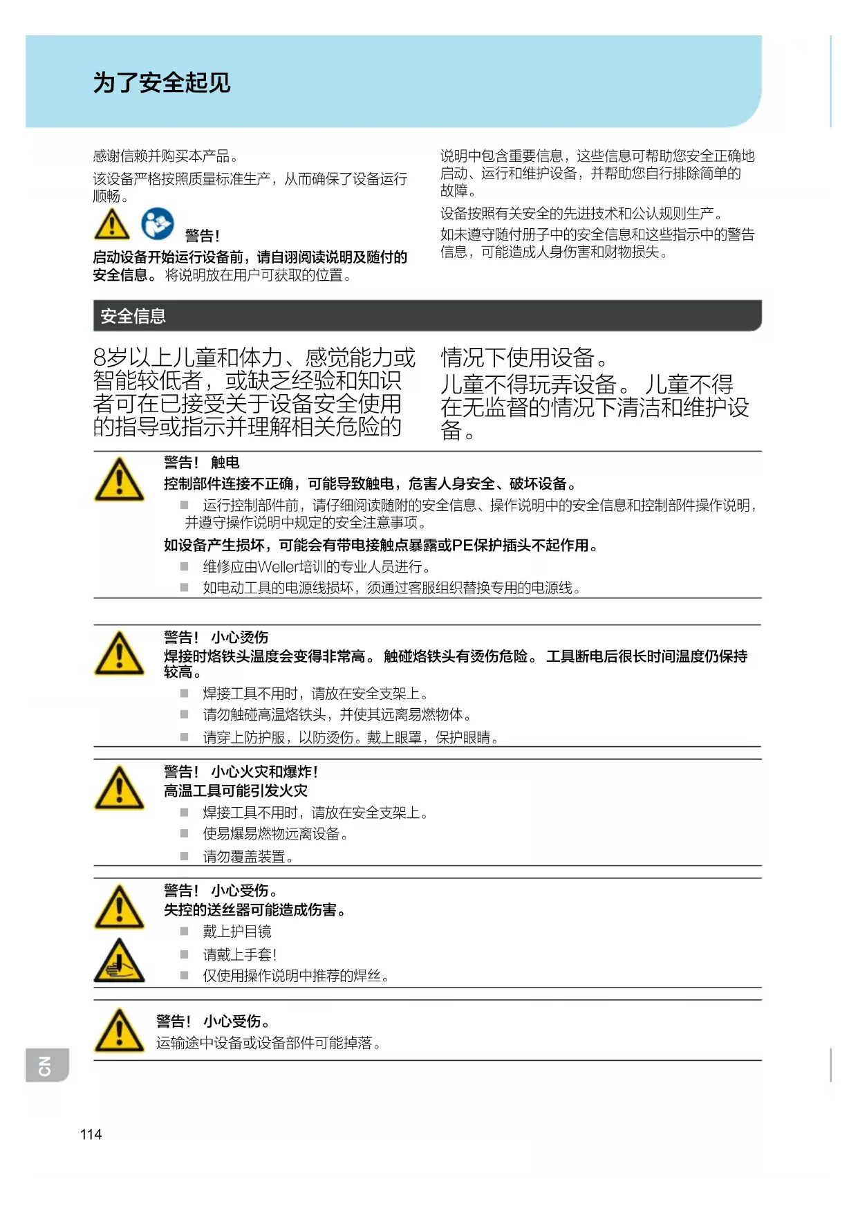 焊接工具不用时,请放在安全支架上。 请勿触碰高温烙铁头,并使其远离易燃物体。 请穿上防护服,以防烫伤。戴上眼罩,保护眼睛。 警告! 小心火灾和爆炸!