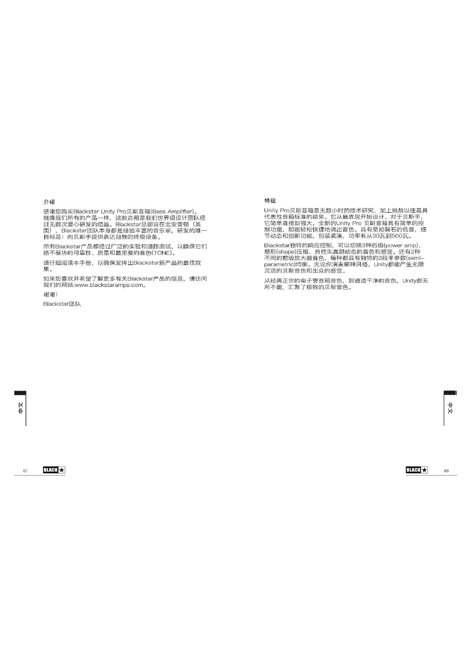 感谢您购买Blackstar Unity Pro贝斯音箱(Bass Amplifier)。 就像我们所有的产品一样,这款音箱是我们世界级设计团队经 过无数次潜心研发的结晶。Blackstar总部设在北安普顿(英 国),Blackstar团队本身都是经验丰富的音乐家,研发的唯一 目标是:向贝斯手提供表达自我的终极设备。 所有Blackstar产品都经过广泛的实验和道路测试,以确保它们 绝不妥协的可靠性、质量和最重要的音色(TONE)。 请仔细阅读本手册,以确保发挥出Blackstar新产品的最佳效