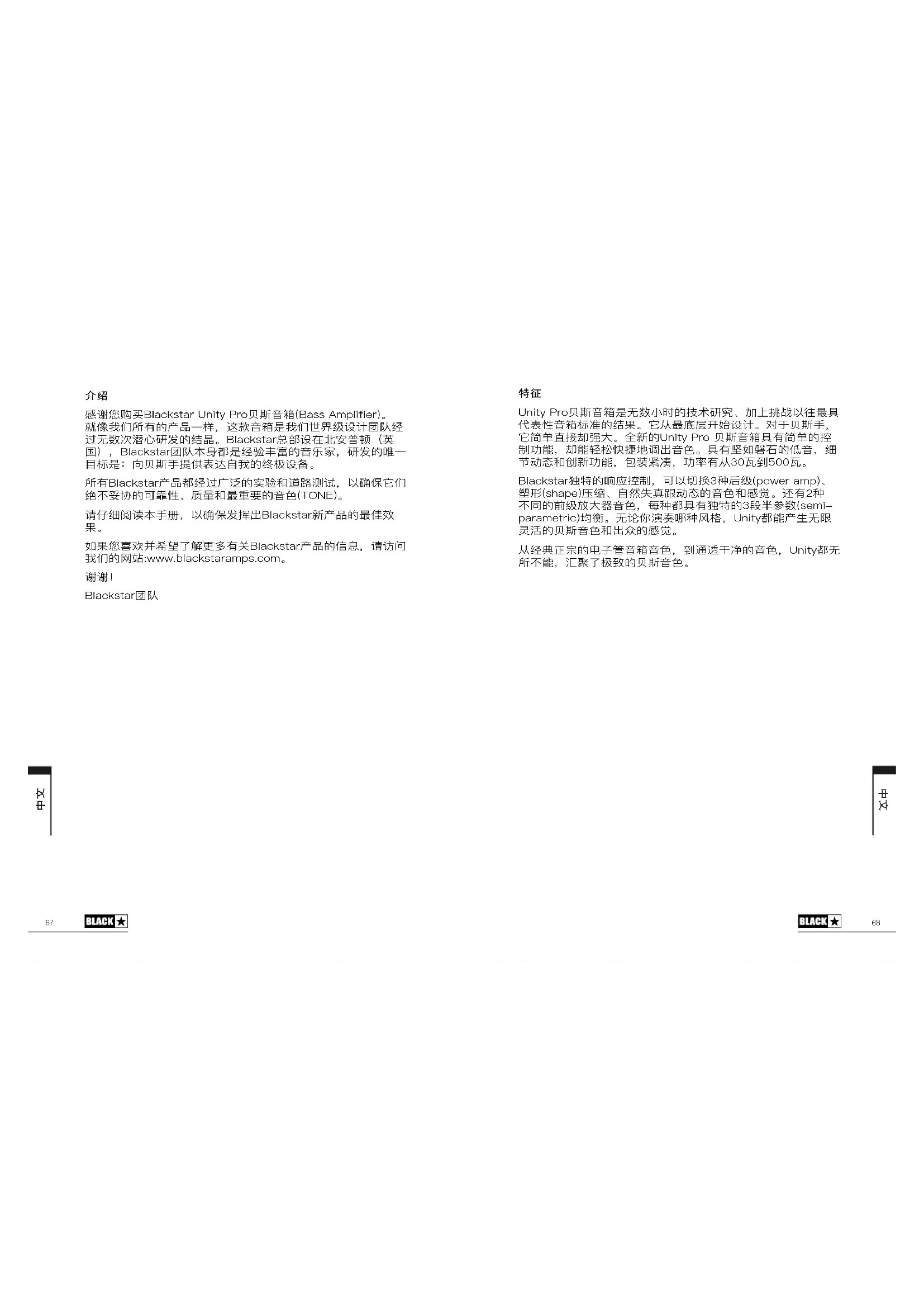 感谢您购买Blackstar Unity Pro贝斯音箱(Bass Amplifier)。 就像我们所有的产品一样,这款音箱是我们世界级设计团队经 过无数次潜心研发的结晶。Blackstar总部设在北安普顿(英 国),Blackstar团队本身都是经验丰富的音乐家,研发的唯一 目标是:向贝斯手提供表达自我的终极设备。 所有Blackstar产品都经过广泛的实验和道路测试,以确保它们 绝不妥协的可靠性、质量和最重要的音色(TONE)。 请仔细阅读本手册,以确保发挥出Blackstar新产品的最佳效