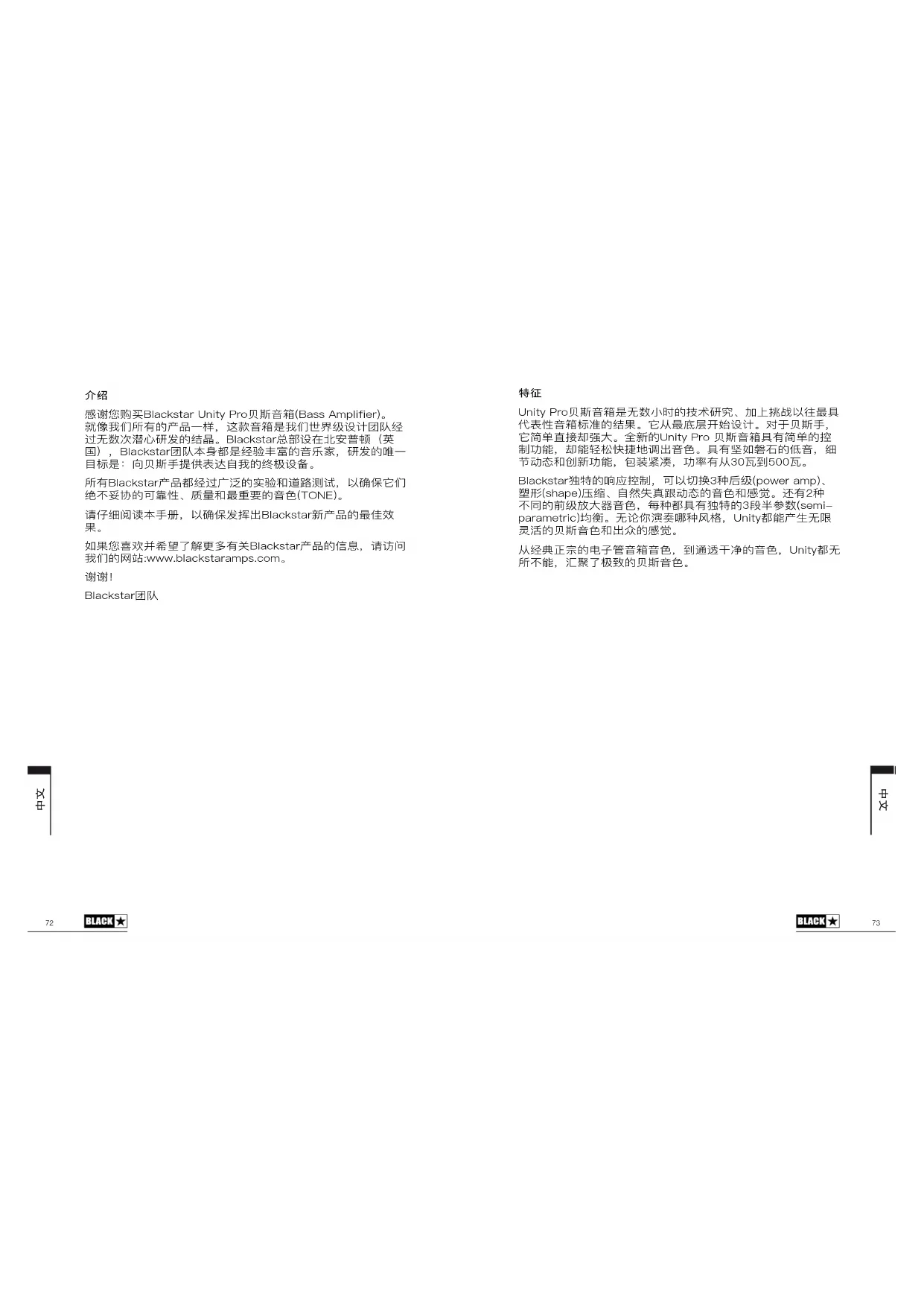 感谢您购买Blackstar Unity Pro贝斯音箱(Bass Amplifier)。 就像我们所有的产品一样,这款音箱是我们世界级设计团队经 过无数次潜心研发的结晶。Blackstar总部设在北安普顿(英 国),Blackstar团队本身都是经验丰富的音乐家,研发的唯一 目标是:向贝斯手提供表达自我的终极设备。 所有Blackstar产品都经过广泛的实验和道路测试,以确保它们 绝不妥协的可靠性、质量和最重要的音色(TONE)。 请仔细阅读本手册,以确保发挥出Blackstar新产品的最佳效