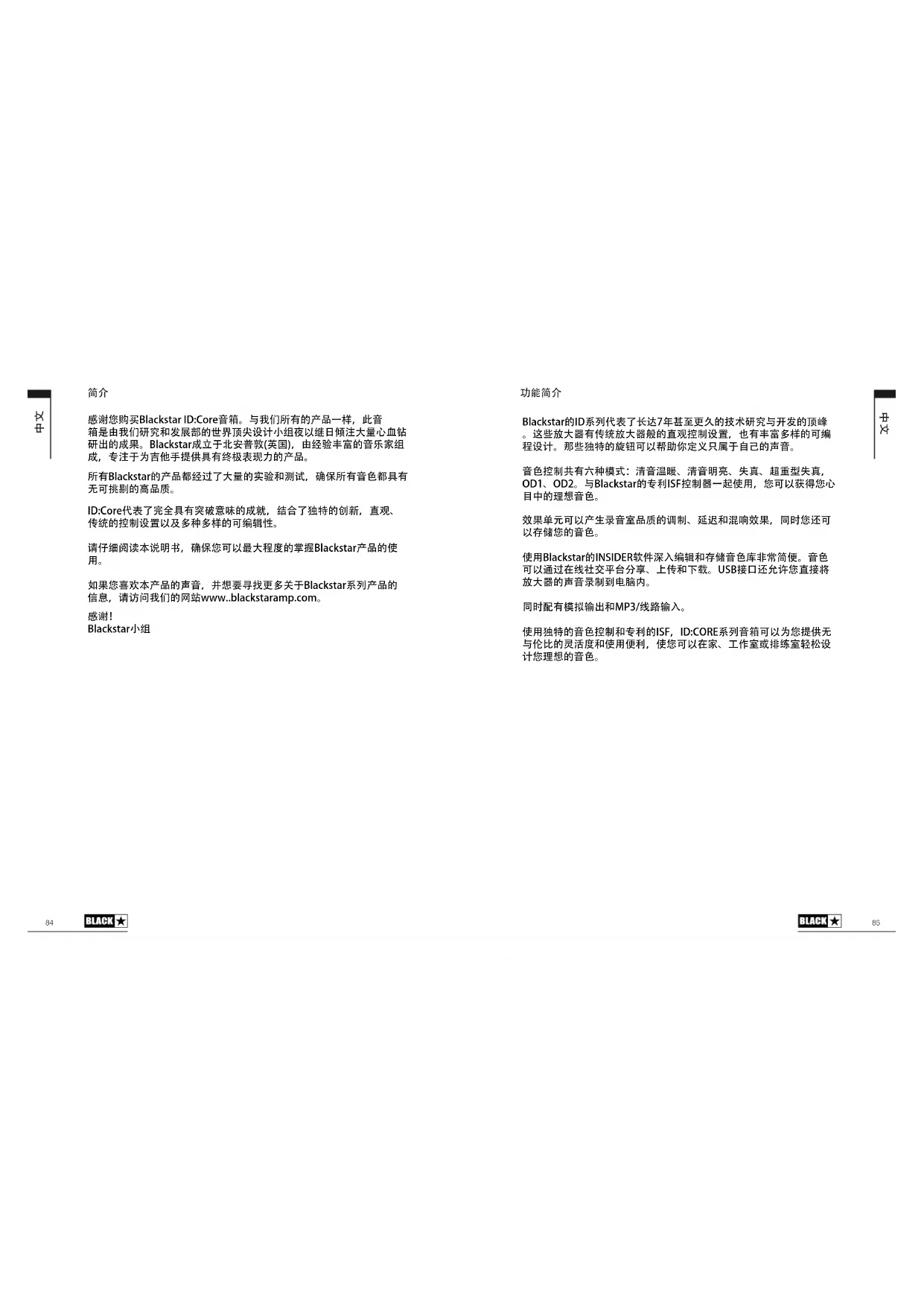 感谢您购买Blackstar ID:Core音箱。与我们所有的产品一样,此音 箱是由我们研究和发展部的世界顶尖设计小组夜以继日倾注大量心血钻 研出的成果。Blackstar成立于北安普敦(英国),由经验丰富的音乐家组 成,专注于为吉他手提供具有终极表现力的产品。 所有Blackstar的产品都经过了大量的实验和测试,确保所有音色都具有
