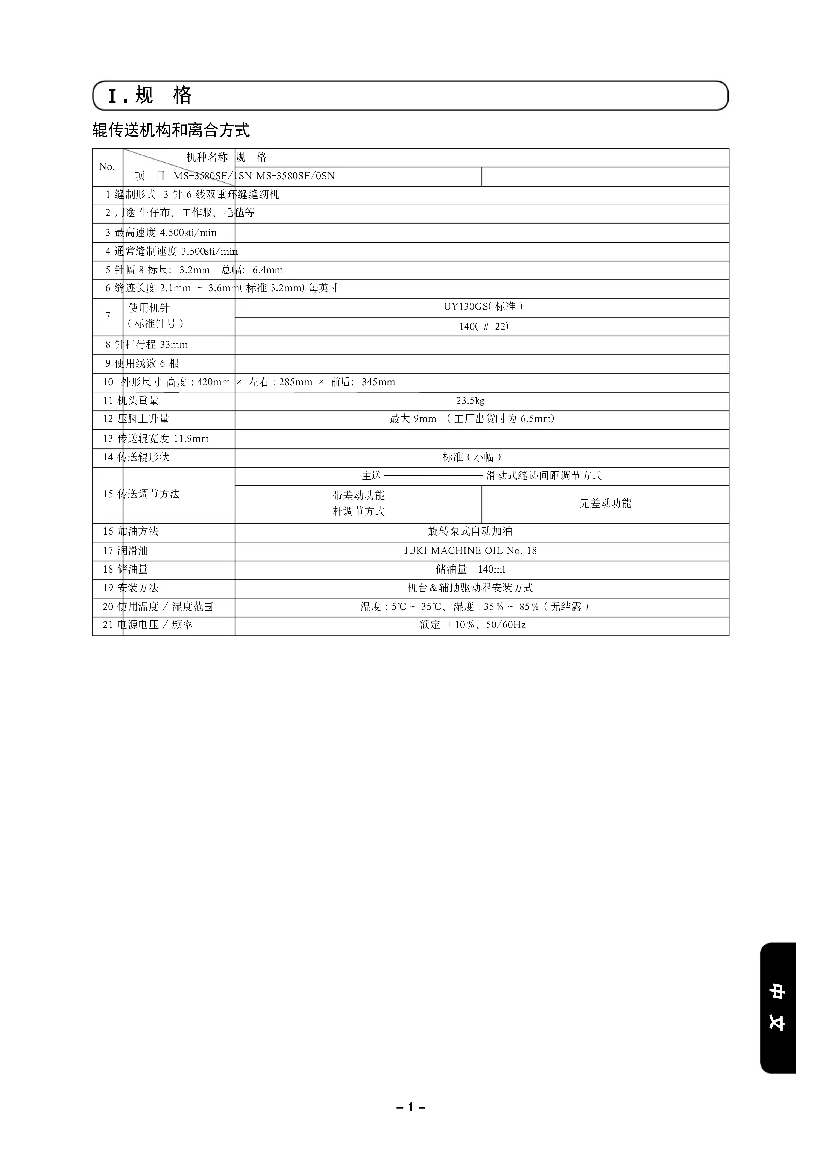 项 目 MS-3580SF/1SN MS-3580SF/0SN 1 缝制形式 3 针 6 线双重环缝缝纫机 2 用途 牛仔布、工作服、毛毡等 3 最高速度 4,500sti/min 4 通常缝制速度 3,500sti/min 5 针幅 8 标尺:3.2mm 总幅:6.4mm 6 缝迹长度 2.1mm ~ 3.6mm( 标准 3.2mm) 每英寸