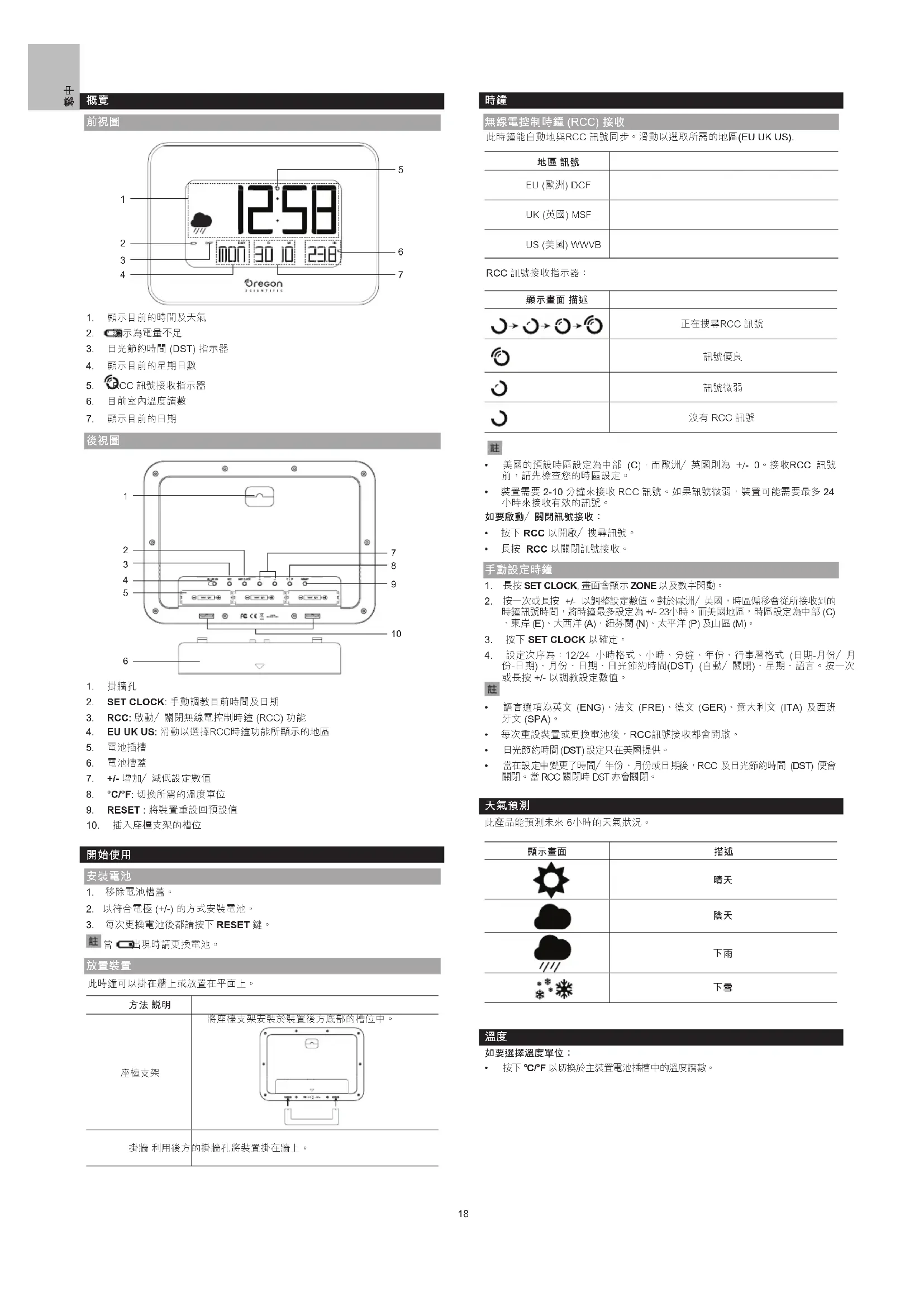 °C/°F 日期格式 月份:日期/日期:月份 星期日數顯示 英文/法文/德文/意大利文/西班牙文 電源 3 x UM-3 (AA) 1.5V 電池 (已提供) 關於OREGON SCIENTIFIC (歐西亞) 瀏覽我們的網站 www.oregonscientific.com 瞭解更多關於歐西亞的產品。 如有任何 疑問 ,請 聯絡 我們 的客 戶服 務 http://global.oregonscientific.com/ customerSupport.php. Oregon Scientific Global Distribution Limited保留權利,隨時行使獨立裁決權,於 未事前通知情況下詮釋和解釋本用戶手冊之任何內容、條款與條件並修改之。若英 語版本與任何其他語言版本有任何不一致處,將以英語版本為準。
