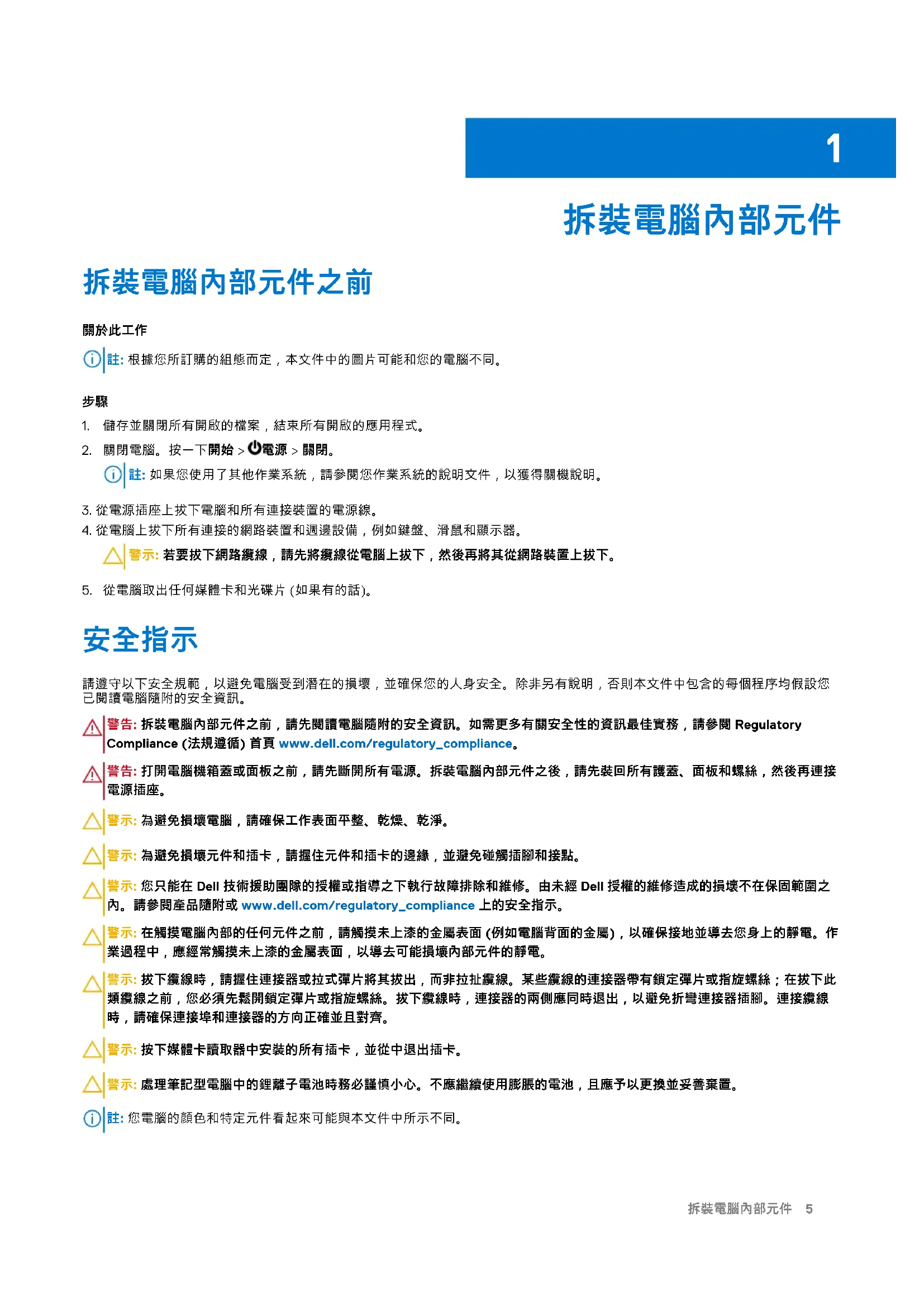 警示: 為避免損壞電腦,請確保工作表面平整、乾燥、乾淨。 警示: 為避免損壞元件和插卡,請握住元件和插卡的邊緣,並避免碰觸插腳和接點。 警示: 您只能在 Dell 技術援助團隊的授權或指導之下執行故障排除和維修。由未經 Dell 授權的維修造成的損壞不在保固範圍之 內。請參閱產品隨附或 www.dell.com/regulatory_compliance 上的安全指示。 警示: 在觸摸電腦內部的任何元件之前,請觸摸未上漆的金屬表面 (例如電腦背面的金屬),以確保接地並導去您身上的靜電。作 業過程中,應經常觸摸未上漆的金屬表面,以導去可能損壞內部元件的靜電。 警示: 拔下纜線時,請握住連接器或拉式彈片將其拔出,而非拉扯纜線。某些纜線的連接器帶有鎖定彈片或指旋螺絲;在拔下此 類纜線之前,您必須先鬆開鎖定彈片或指旋螺絲。拔下纜線時,連接器的兩側應同時退出,以避免折彎連接器插腳。連接纜線 時,請確保連接埠和連接器的方向正確並且對齊。 警示: 按下媒體卡讀取器中安裝的所有插卡,並從中退出插卡。 警示: 處理筆記型電腦中的鋰離子電池時務必謹慎小心。不應繼續使用膨脹的電池,且應予以更換並妥善棄置。 註: 您電腦的顏色和特定元件看起來可能與本文件中所示不同。