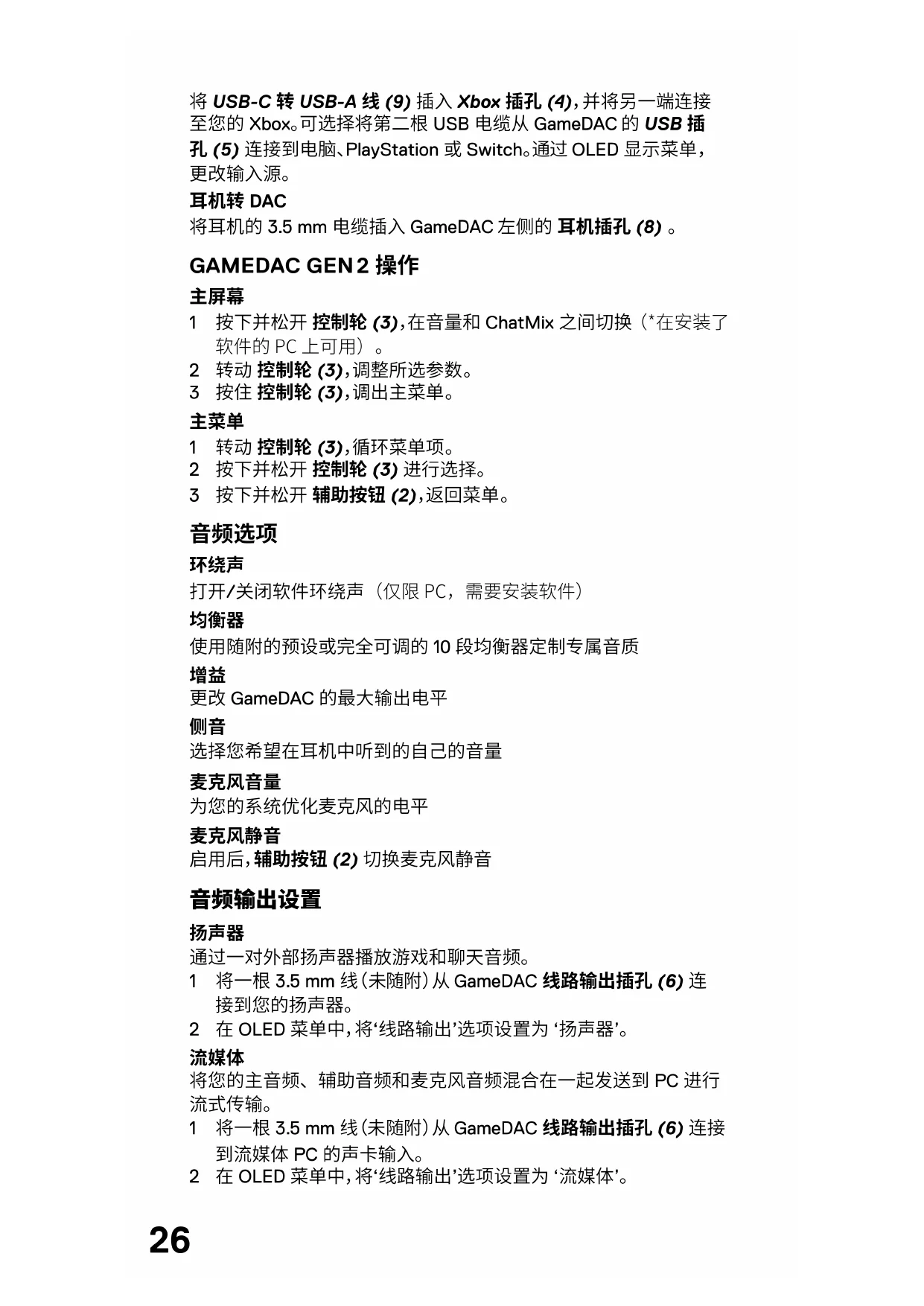 1 将一根 3.5 mm 线( 未 随 附 )从 GameDAC 线路输出插孔 (6) 连接 到流媒体 PC 的声卡输入。 2 在 OLED 菜单中,将‘线路输出’选项设置为 ‘流媒体’。27 3 通过 OLED 屏幕上的 Stream Mixer,调整您的自定义混音。