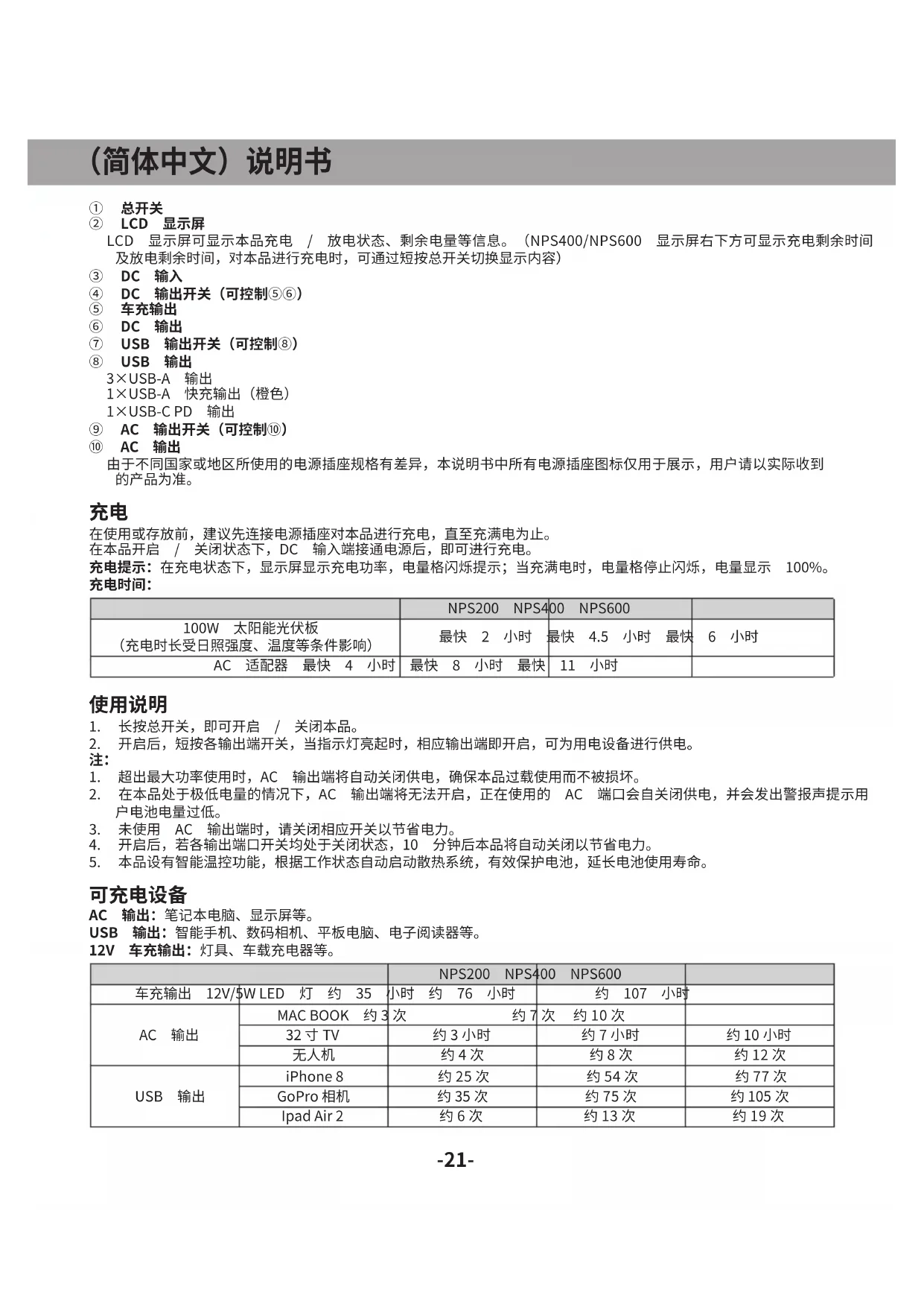 车充输出 12V/5WLED 灯 约 35 小时 约 76 小时 约 107 小时 AC 输出 MACBOOK 约3次 约7次 约10次 32 寸 TV 约3小时 约7小时 约 10 小时 无人机 约4次 约8次 约12次 USB 输出 iPhone8 约25次 约54次 约77次 GoPro 相机 约35次 约75次 约 105 次 IpadAir2 约6次 约13次 约19次 -21-(简体中文)说明书