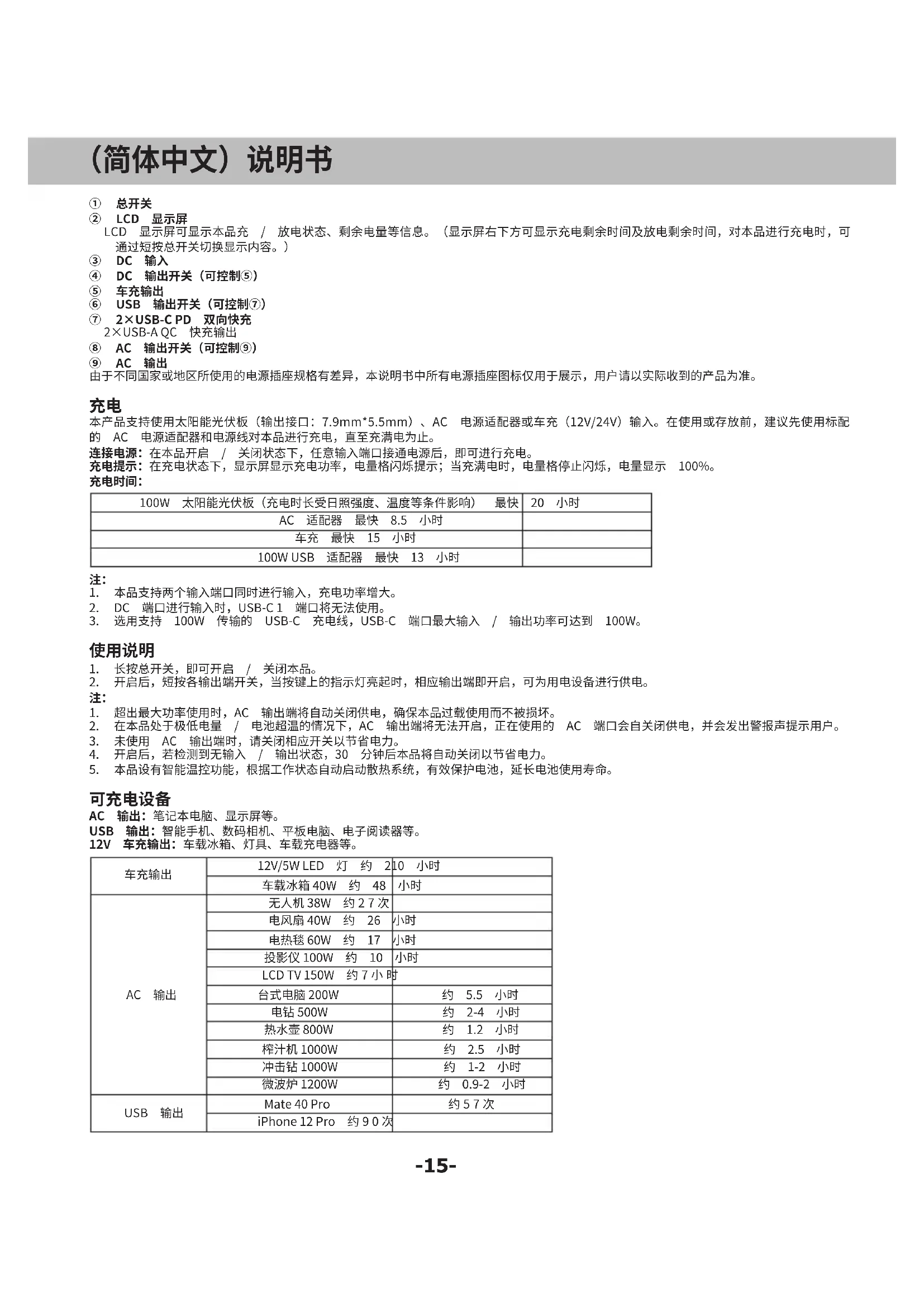 12V/5WLED 灯 约 210 小时 车载冰箱40W 约 48 小时 AC 输出 无人机38W 约27次 电风扇40W 约 26 小时 电热毯60W 约 17 小时 投影仪100W 约 10 小时 LCDTV150W 约7小时 台式电脑200W 约 5.5 小时 电钻500W 约 2-4 小时 热水壶800W 约 1.2 小时 榨汁机1000W 约 2.5 小时 冲击钻1000W 约 1-2 小时 微波炉1200W 约 0.9-2 小时 USB 输出 Mate40Pro 约57次 iPhone12Pro 约90次-16- USB 输出 MacBookPro16 寸 约9次 iPadPro12.9 寸 约25次 Switch 约58次 注:数据来源于奈特科尔实验室,仅供参考,实际使用情况受用电设备功率、环境温度等因素影响。 低电量提示:本品在放电状态下,当电池电量低于 10% 时,本品将会发出警报声,且显示屏电量参数闪烁提示用户电池电量过低,需要及时充电。