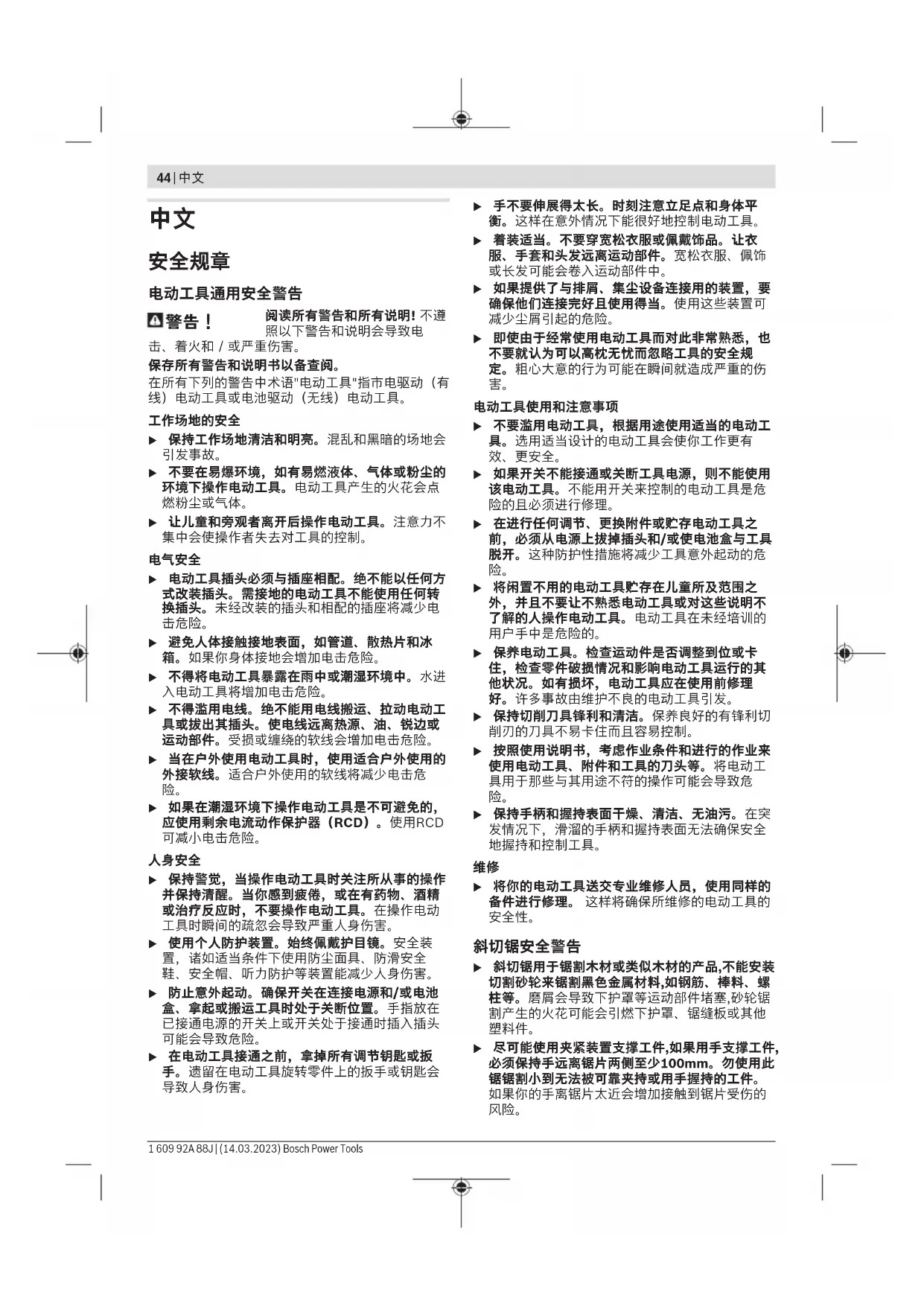 1 609 92A 88J | (14.03.2023) Bosch Power Tools中文 | 45 u 工件必须定位并被夹紧或抵靠在靠栅和工作台上, 不要将工件送入锯片或以任何方式“徒手”锯 割。不受约束的或移动的工件有可能会被高速抛
