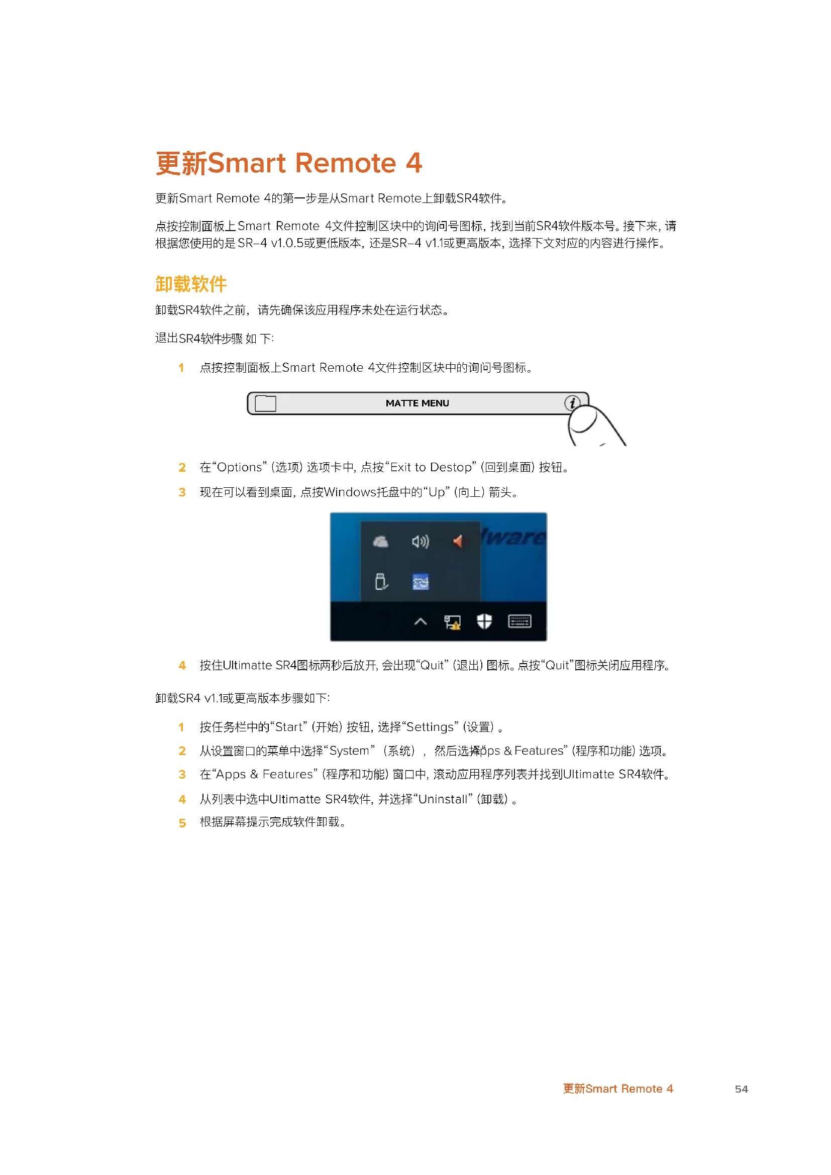SmartRemote454 卸载软件 54 安装UltimatteSmartRemoteSetup56 帮助 59 监管告知与安全信息 60 保修 61 UltimatteSmartRemote4更新Smart Remote 4 更新Smart Remote 4的第一步是从Smart Remote上卸载SR4软件。 Smart Remote 4文件控制区块中的询问号图标,找到当前SR4软件版本号。接下来,请 SR-4 v1.0.5或更低版本,还是SR-4 v1.1或更高版本,选择下文对应的内容进行操作。