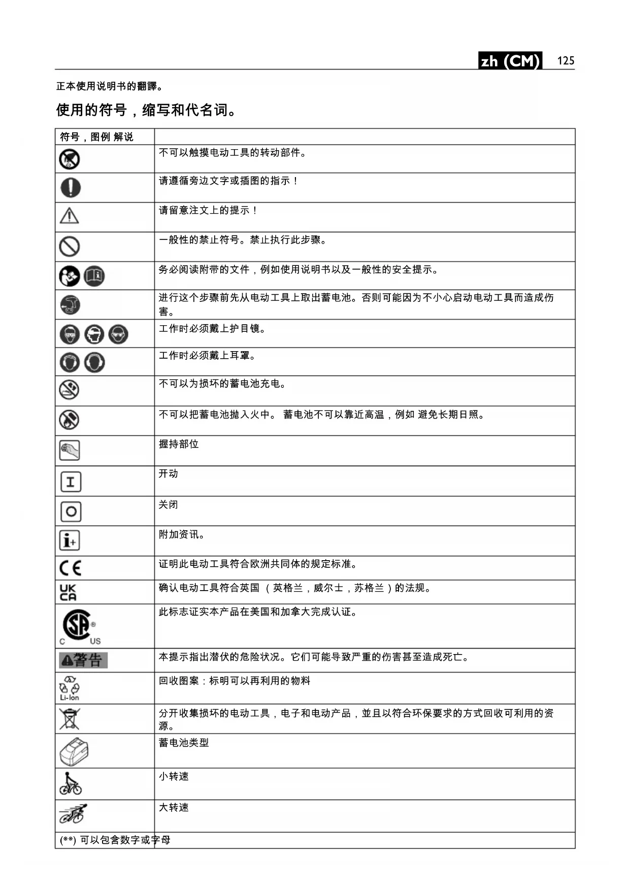 證明此電動工具符合歐洲共同體的規定標準。 確認電動工具符合英國 (英格蘭,威爾士,蘇格蘭)的法規。 此標志證實本產品在美國和加拿大完成認證。 本標示提示潛伏的危險狀況。它們可能導致嚴重的傷害甚至造成死亡。 回收圖案:標明可以再利用的物料 分類收集已損壞的電動工具,電子和電動產品,並且以符合環保要求的方式回收 , 可使有用