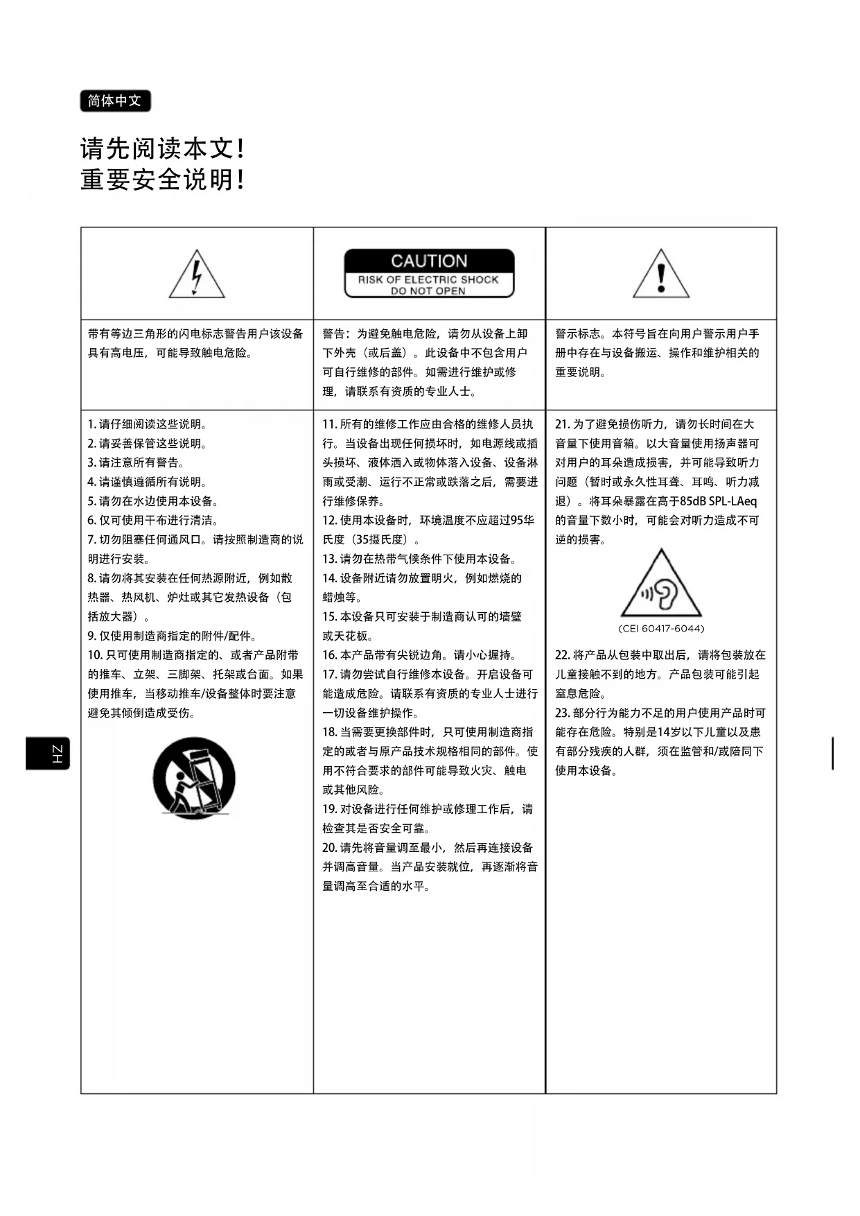 带有等边三角形的闪电标志警告用户该设备 具有高电压,可能导致触电危险。 警告:为避免触电危险,请勿从设备上卸 下外壳(或后盖)。此设备中不包含用户 可自行维修的部件。如需进行维护或修 理,请联系有资质的专业人士。 警示标志。本符号旨在向用户警示用户手 册中存在与设备搬运、操作和维护相关的