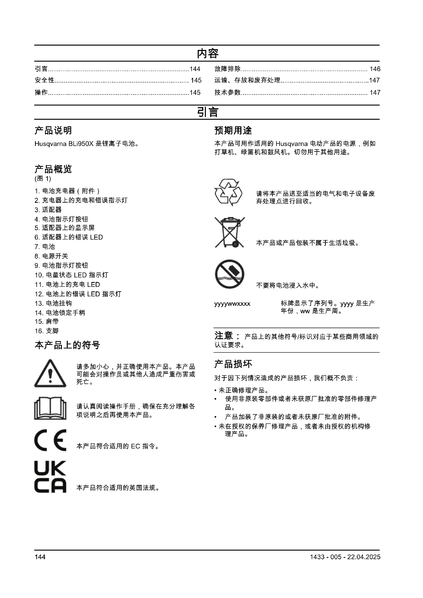 - 仅将可充电的 BLi950X 电池作为电源用于相关的 Husqvarna 产品。为避免造成伤害,请勿将这些电池 作为电源用于其他装置。