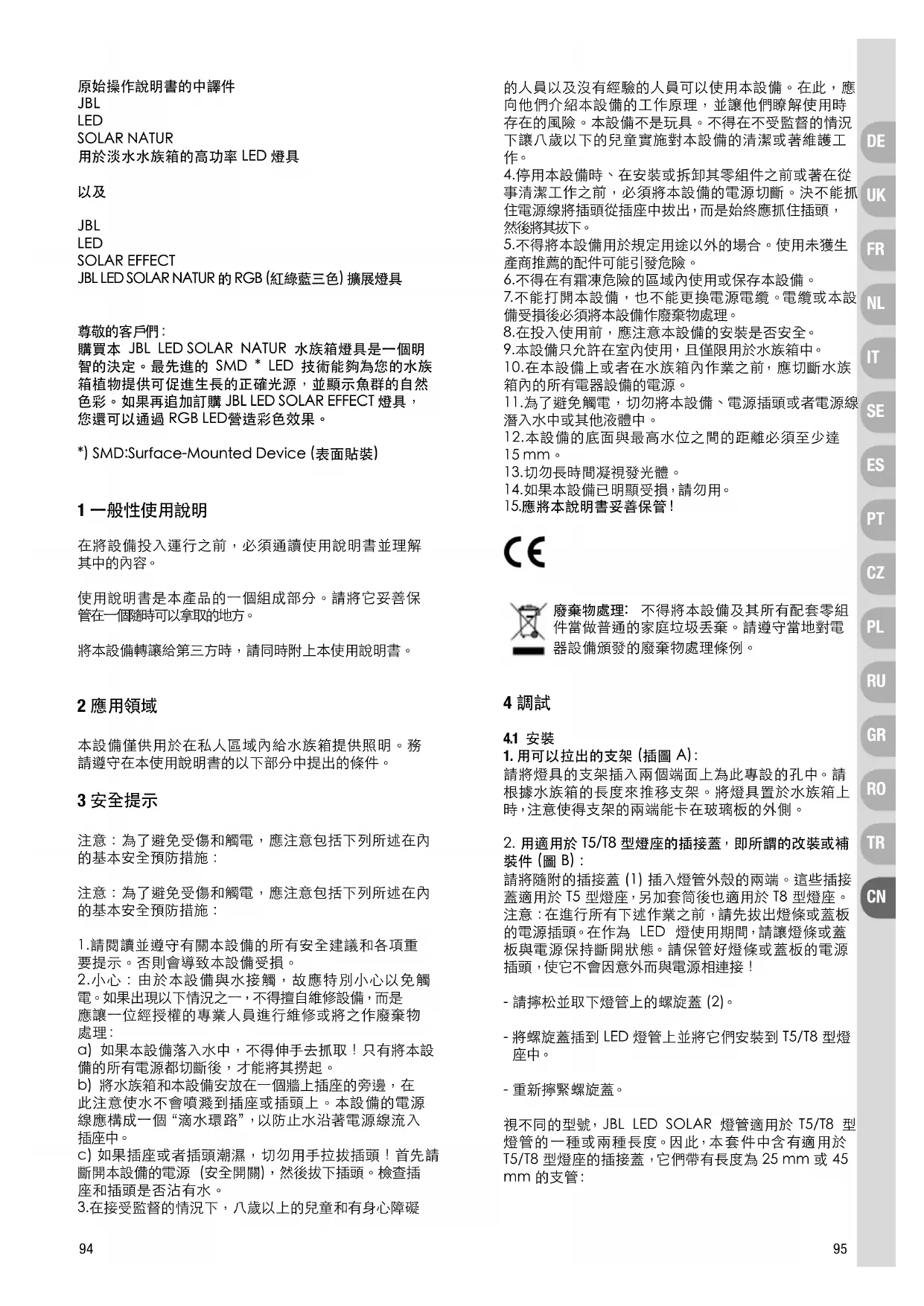 原始操作說明書的中譯件 JBL LED SOLAR NATUR 用於淡水水族箱的高功率 LED 燈具