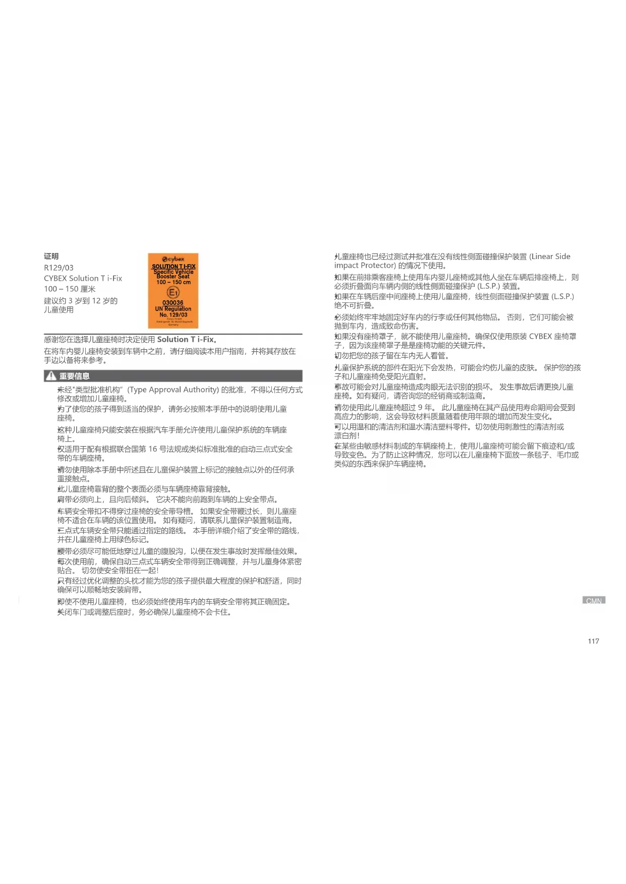 Cybex GmbHRiedingerstr. 18, 95448 BayreuthGermany UN Regulation No. 129/03 感谢您在选择儿童座椅时决定使用 Solution T i-Fix。 在将车内婴儿座椅安装到车辆中之前,请仔细阅读本用户指南,并将其存放在