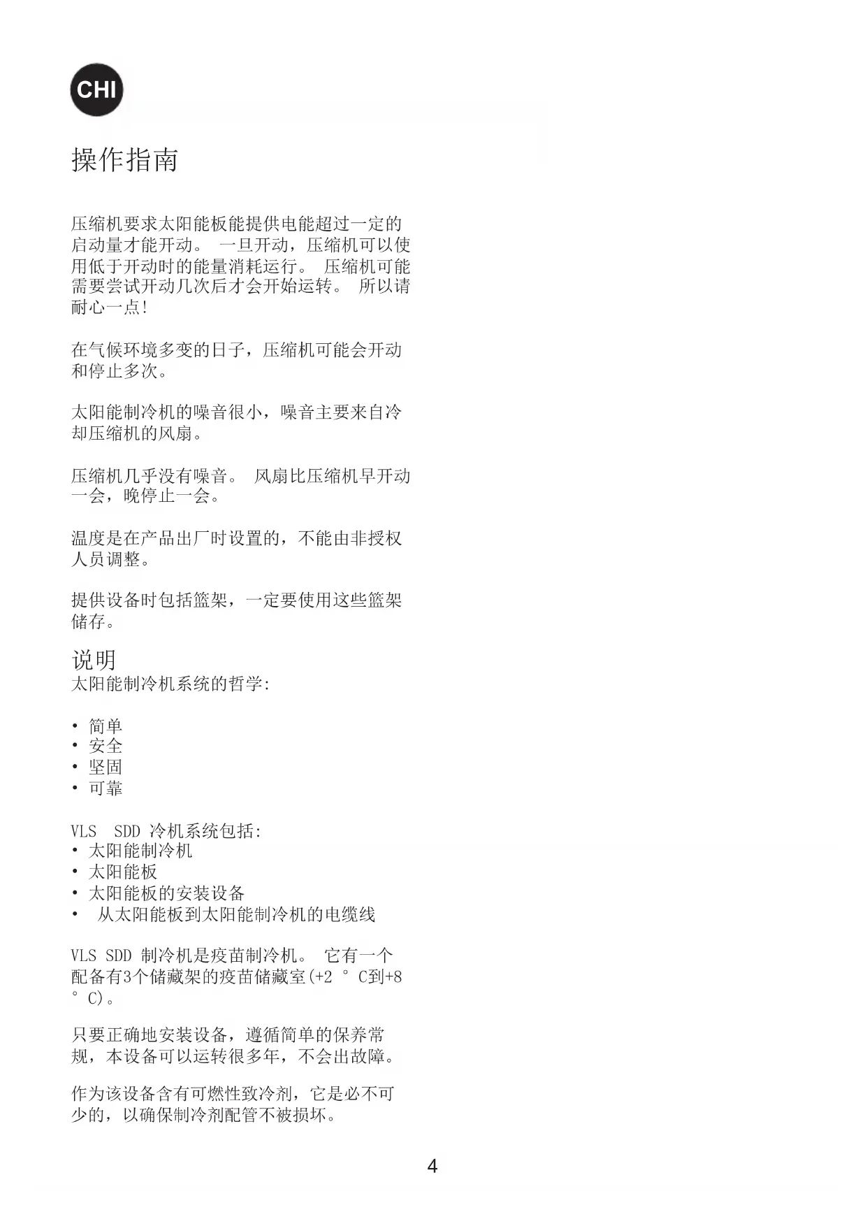 - 从太阳能板到太阳能制冷机的电缆线 VLS SDD 制冷机是疫苗制冷机。 它有一个 配备有3个储藏架的疫苗储藏室(+2 °C到+8 °C)。 只要正确地安装设备,遵循简单的保养常 规,本设备可以运转很多年,不会出故障。 作为该设备含有可燃性致冷剂,它是必不可 少的,以确保制冷剂配管不被损坏。 压缩机要求太阳能板能提供电能超过一定的 启动量才能开动。 一旦开动,压缩机可以使 用低于开动时的能量消耗运行。 压缩机可能 需要尝试开动几次后才会开始运转。 所以请