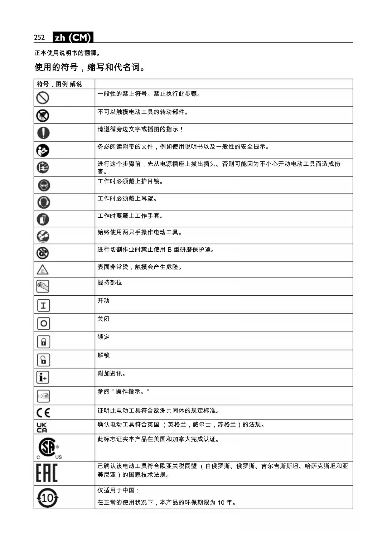 在正常的使用状况下,本产品的环保期限为 10 年。253 zh (CM) 本提示指出潜伏的危险状况。它们可能导致严重的伤害甚至造成死亡。 分开收集损坏的电动工具,电子和电动产品,並且以符合环保要求的方式回收可利用的资