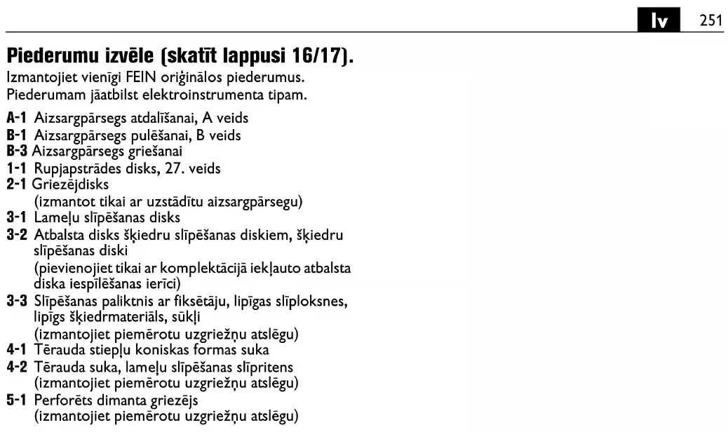 A-1 切割用防護罩,A 型 B-1 研磨用防護罩,B 型 B-3 切割用保護罩 1-1 粗砂輪,27 型 2-1 切割片 (只能配合保護罩一起使用) 3-1 襟翼磨盤 3-2 纖維盤的背襯 、纖維盤 (僅能使用提供的背襯夾緊裝置安裝) 3-3 帶魔術貼的磨盤、粘合砂紙、粘合研磨絨布、海綿 ( 使用合適的開口扳手 ) 4-1 鋼絲 - 錐形刷 4-2 鋼絲 - 杯刷、襟翼輪 ( 使用合適的開口扳手 ) 5-1 金剛石開孔器 (請使用一把開口扳手)267