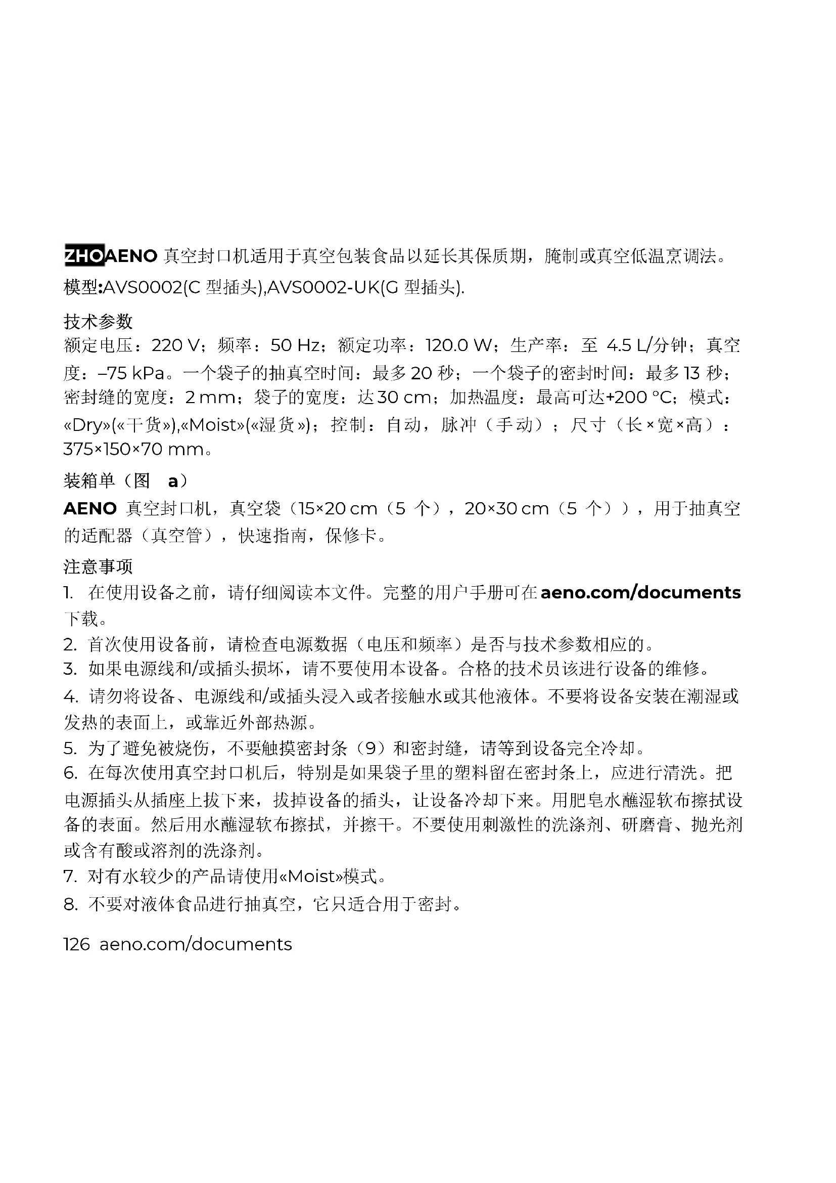 8. 不要对液体食品进行抽真空,它只适合用于密封。aeno.com/documents 127