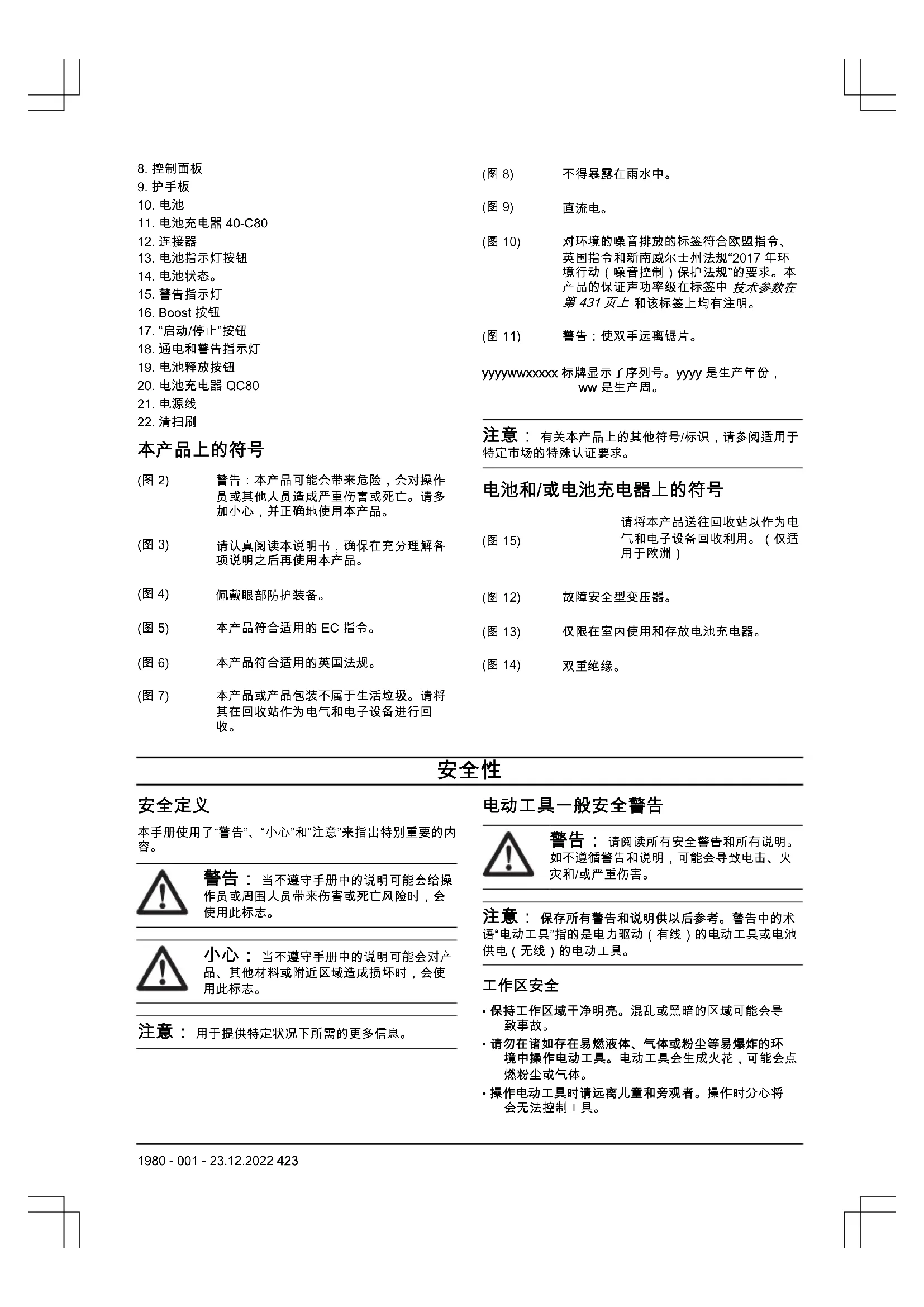 1980 - 001 - 23.12.2022• 有发生电击的危险。请勿将电池端子连接至钥匙、硬 币、螺钉或其他金属上。这会导致电池短路。