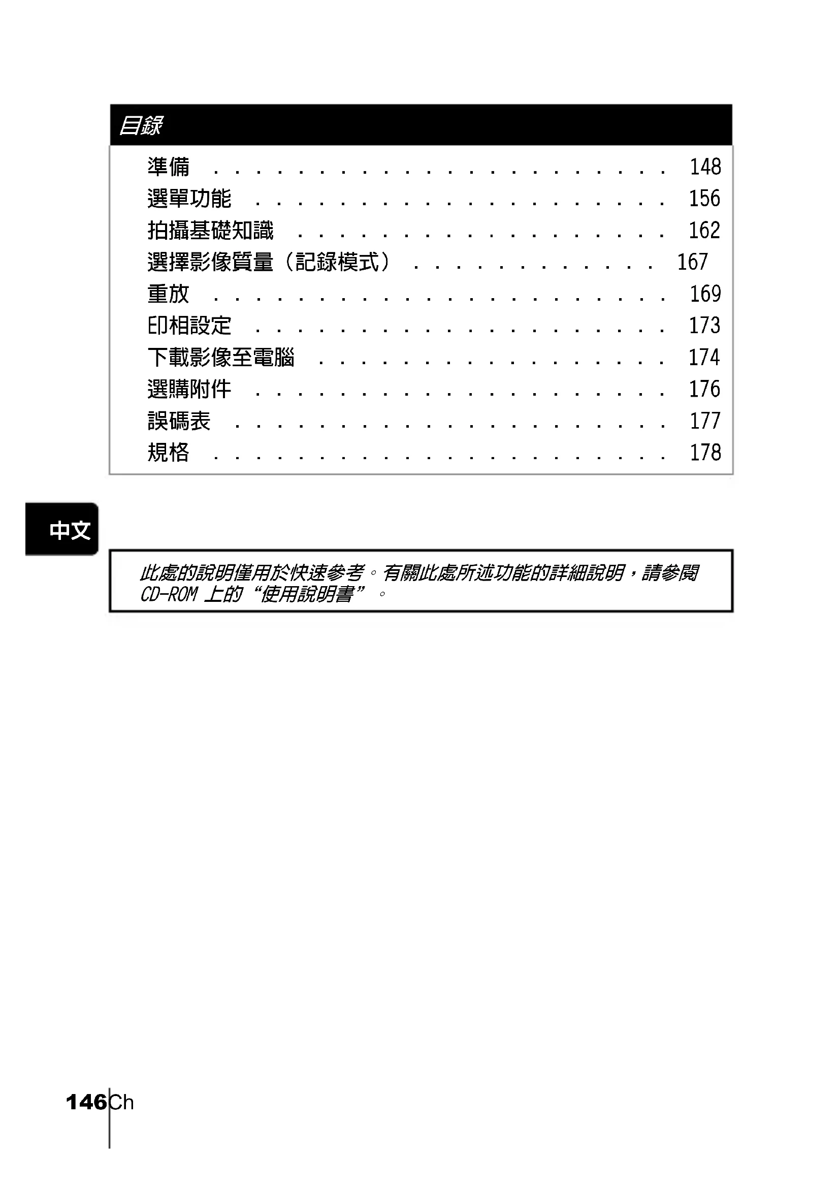 - 本說明書中所引用的照相機檔案系統標準為日本電子及資訊技術工業協會 (JEITA) 制定的“照相機檔案系統設計規則(DCF)"標 準。 “CE"標記表示本產品符合歐洲安全、衛生、環境和用戶保護要求。 帶“ CE"標記的照相機將在歐洲銷售。148 Ch