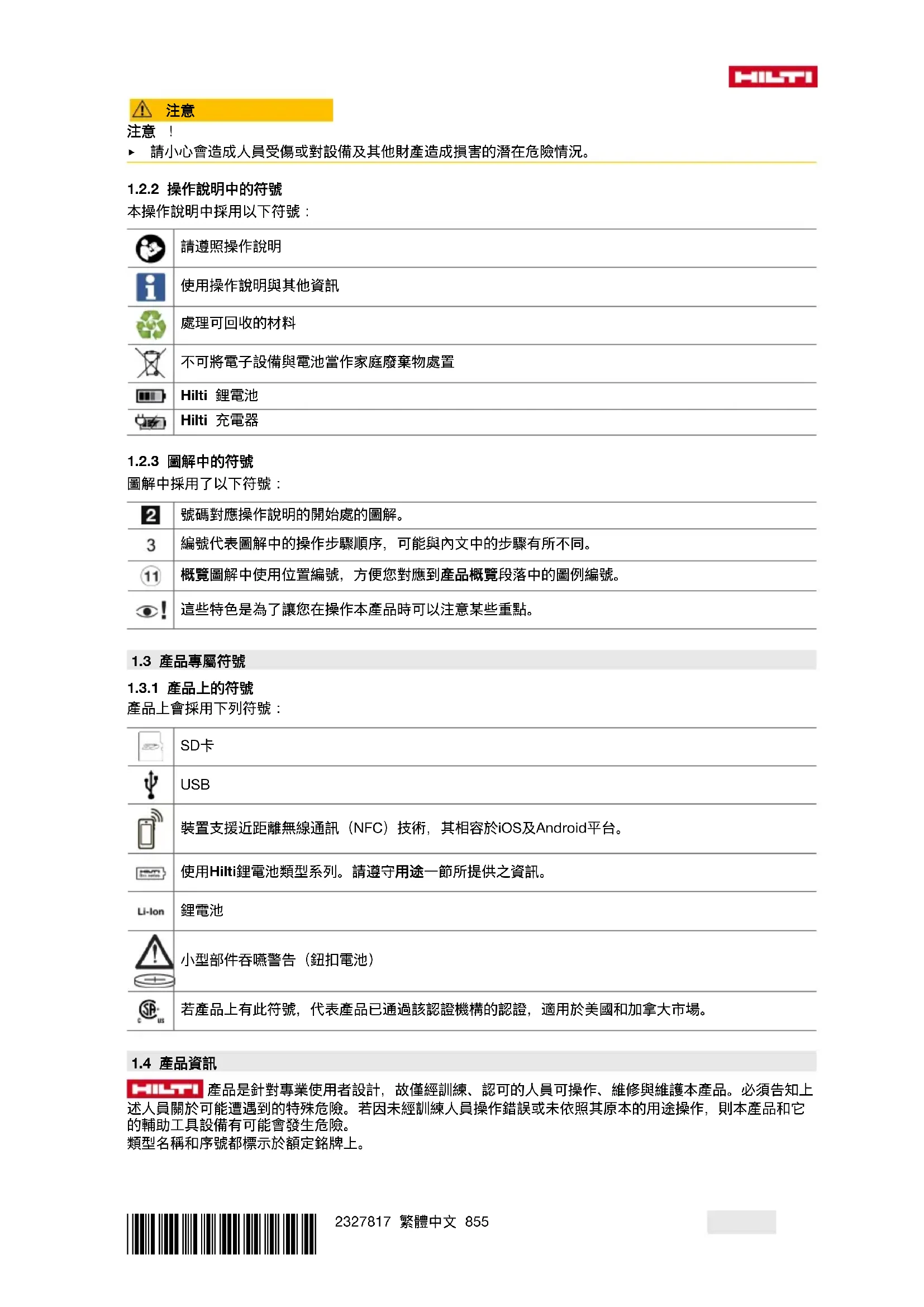 產品上會採用下列符號: SD卡 USB 裝置支援近距離無線通訊(NFC)技術,其相容於iOS及Android平台。 使用Hilti鋰電池類型系列。請遵守用途一節所提供之資訊。