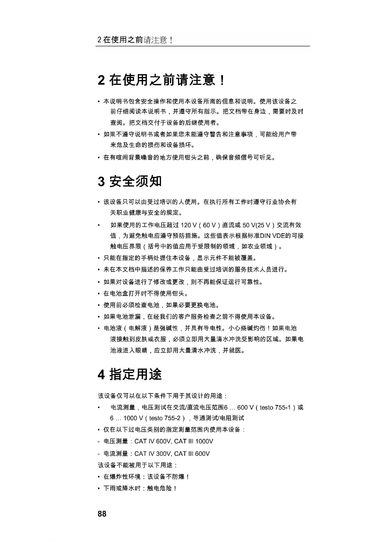 - 电池液(电解液)是强碱性,并具有导电性。小心烧碱灼伤!如果电池 液接触到皮肤或衣服,必须立即用大量清水冲洗受影响的区域。如果电 池液进入眼睛,应立即用大量清水冲洗,并就医。 4 指定用途 该设备仅可以在以下条件下用于其设计的用途: