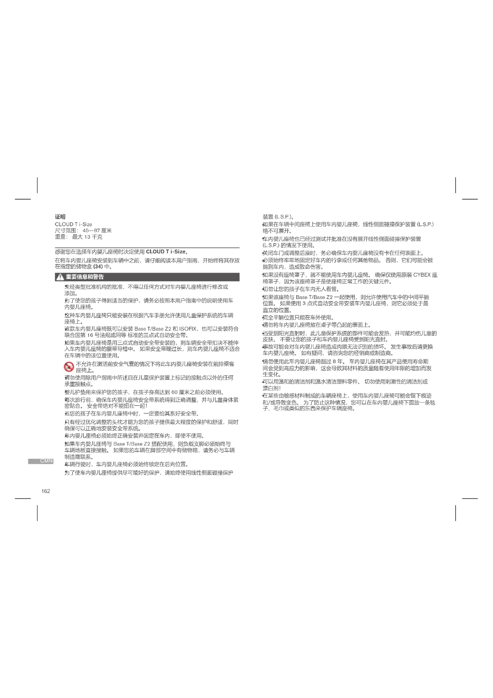CYBEX GmbH (Riedingerstr. 18, 95448 Bayreuth, Germany) 为您提供 3 年保 修。 保修在零售商最初向客户出售该产品的国家/地区有效。 我们的主页上提供 了保修的内容和请求保修时所需提供的所有基本信息: go.cybex-online.com/manufacturer-warranty-car-seats。 如果产品说明中 显示了保修,则您对我们的缺陷享有的法律权利将不受影响。 请遵守您所在国家/地区的废物处理规定。166 YUE 感謝您在選擇車內嬰兒座椅時決定使用 CLOUD T i-Size。 在將車內嬰兒座椅安裝到車輛中之前,請仔細閱讀本使用者指南,並始終將其存 放在指定的儲物盒 (34) 中。