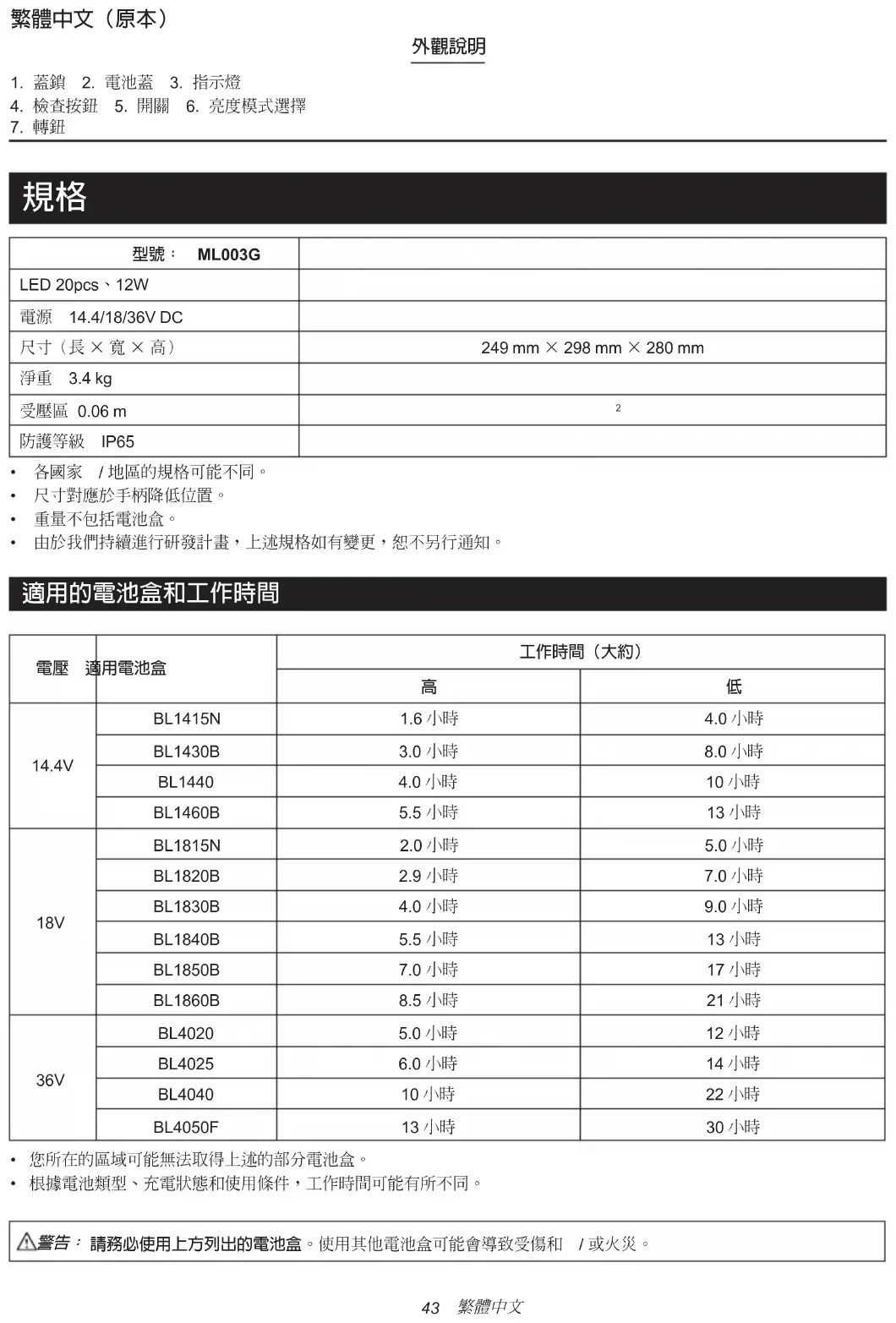 由於我們持續進行研發計畫,上述規格如有變更,恕不另行通知。 適用的電池盒和工作時間 電壓 適用電池盒工作時間(大約) 14.4V BL1415N 1.6 小時 4.0 小時 BL1430B 3.0 小時 8.0 小時 BL1440 4.0 小時 10 小時 BL1460B 5.5 小時 13 小時 18V BL1815N 2.0 小時 5.0 小時 BL1820B 2.9 小時 7.0 小時 BL1830B 4.0 小時 9.0 小時 BL1840B 5.5 小時 13 小時 BL1850B 7.0 小時 17 小時 BL1860B 8.5 小時 21 小時 36V BL4020 5.0 小時 12 小時 BL4025 6.0 小時 14 小時 BL4040 10 小時 22 小時 BL4050F 13 小時 30 小時